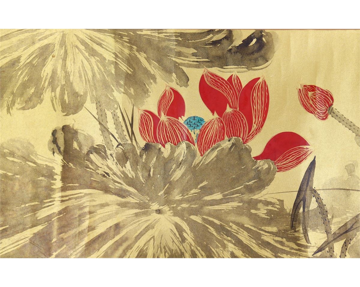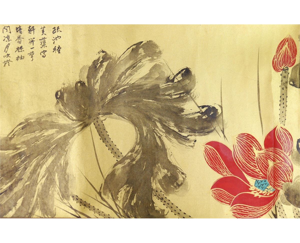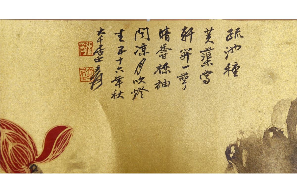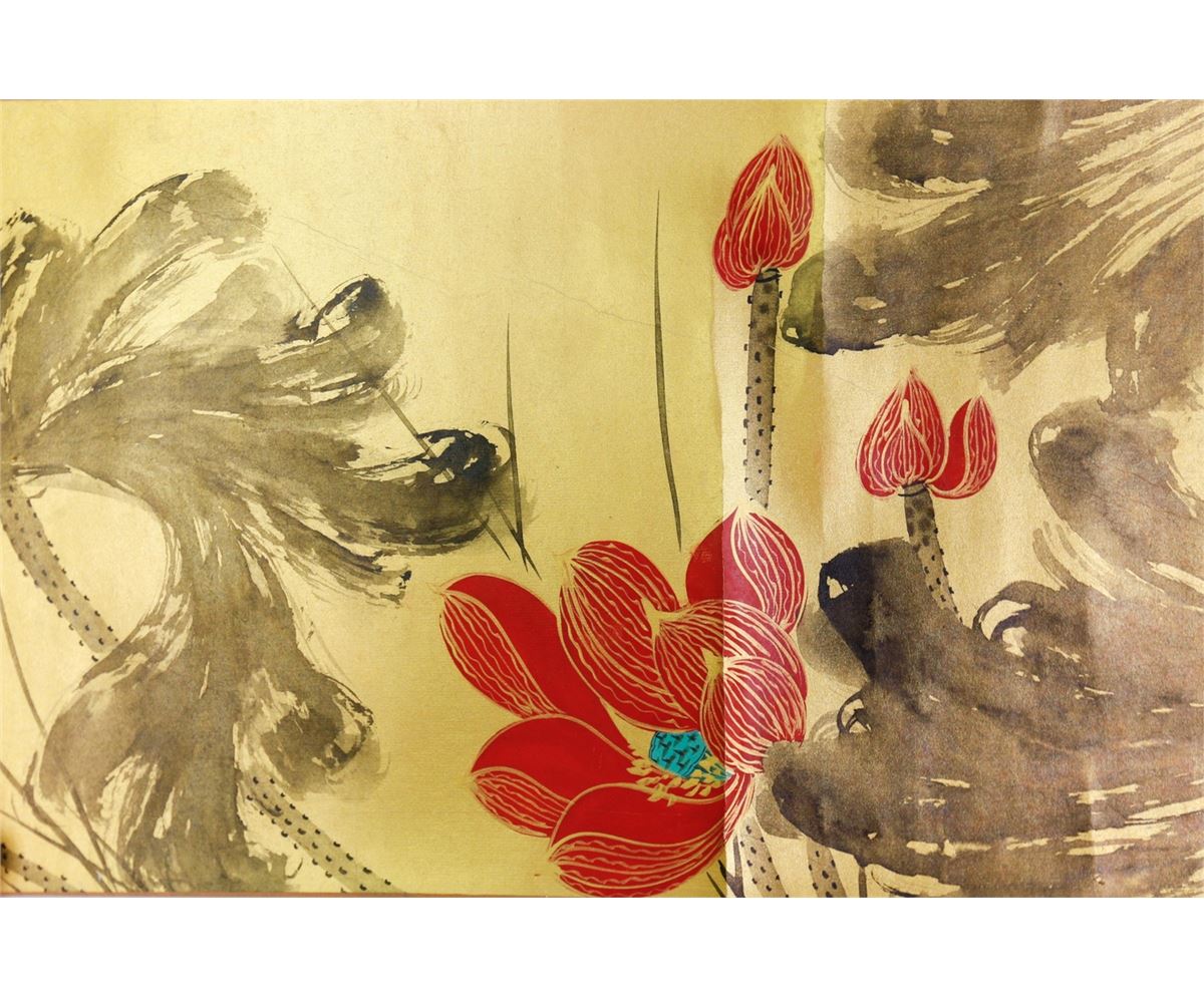 Gilt lotus; Chinese ink and watercolour on golden paper; hand scroll; signed Zhang Daqian and inscribed with two artist seals; 29.5 cm x 66cm title, 29.5 cm x 168.5 cm painting
