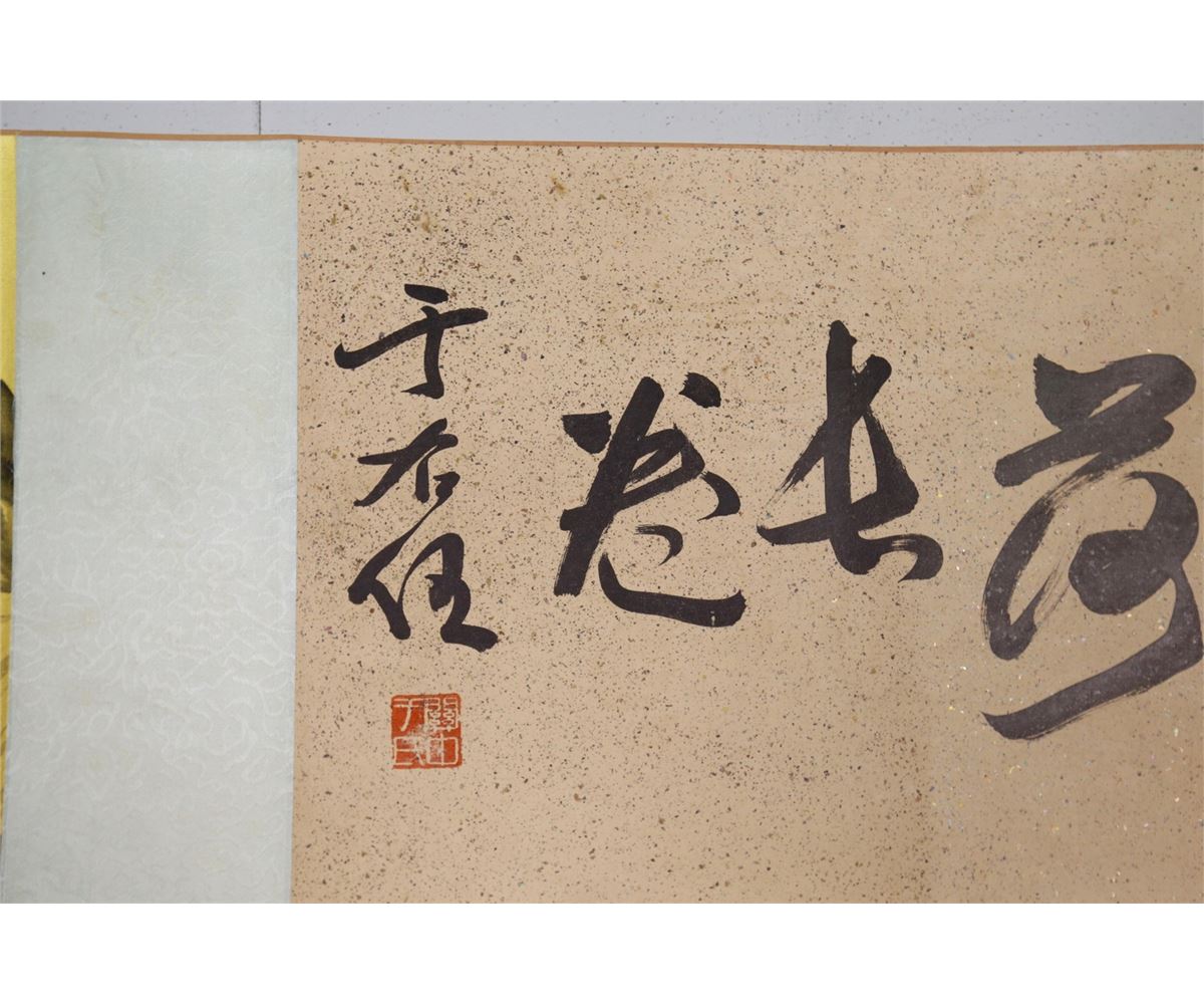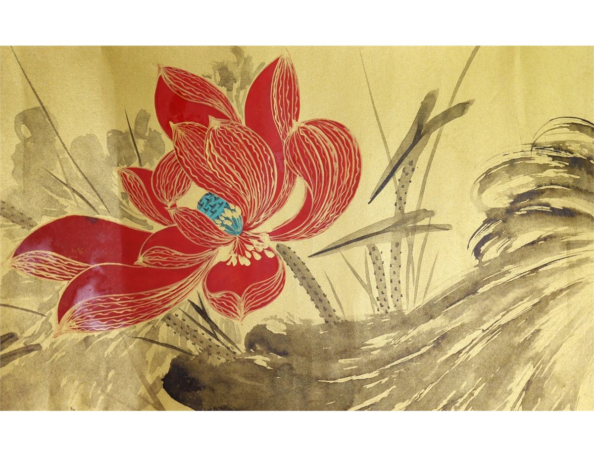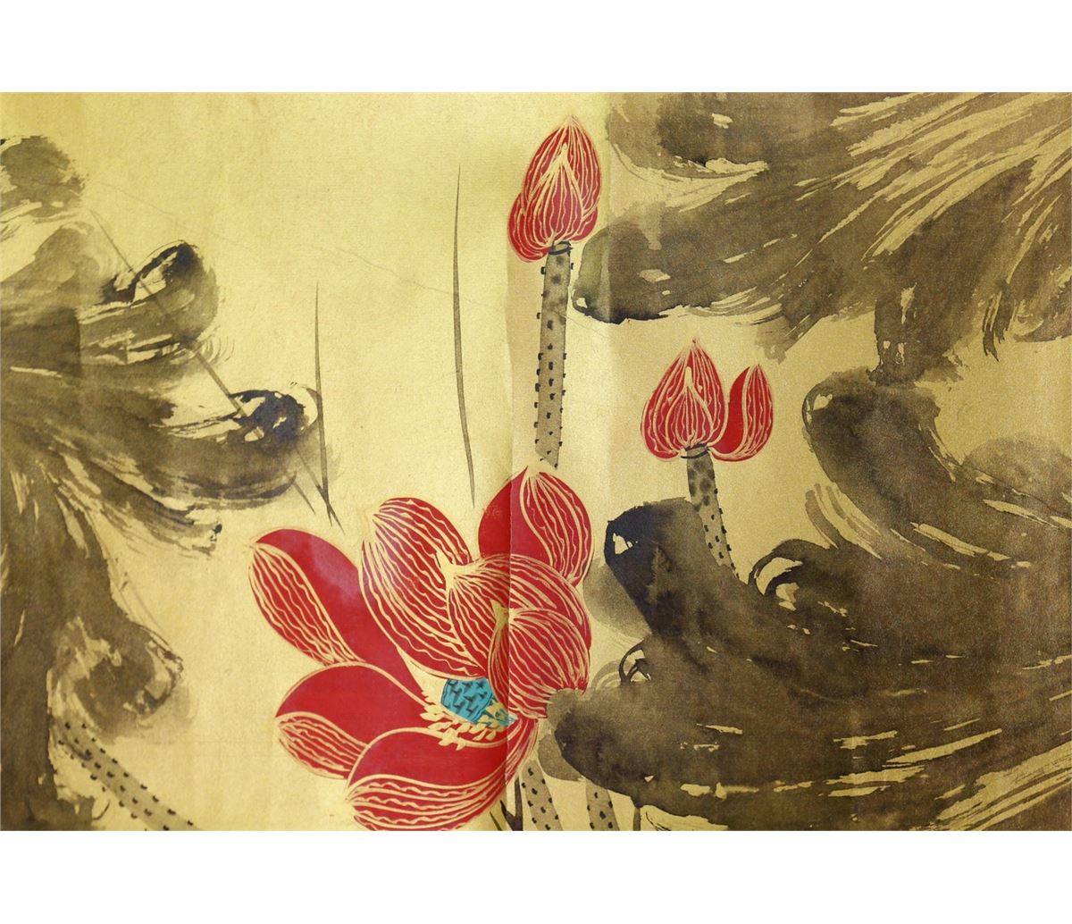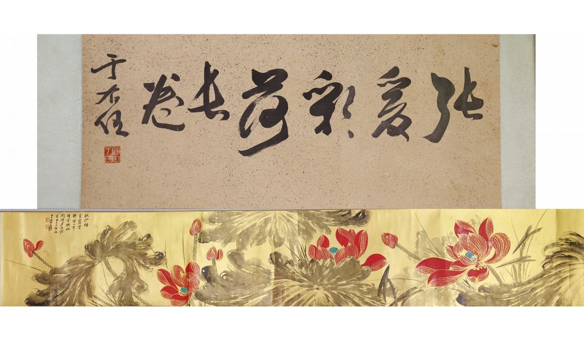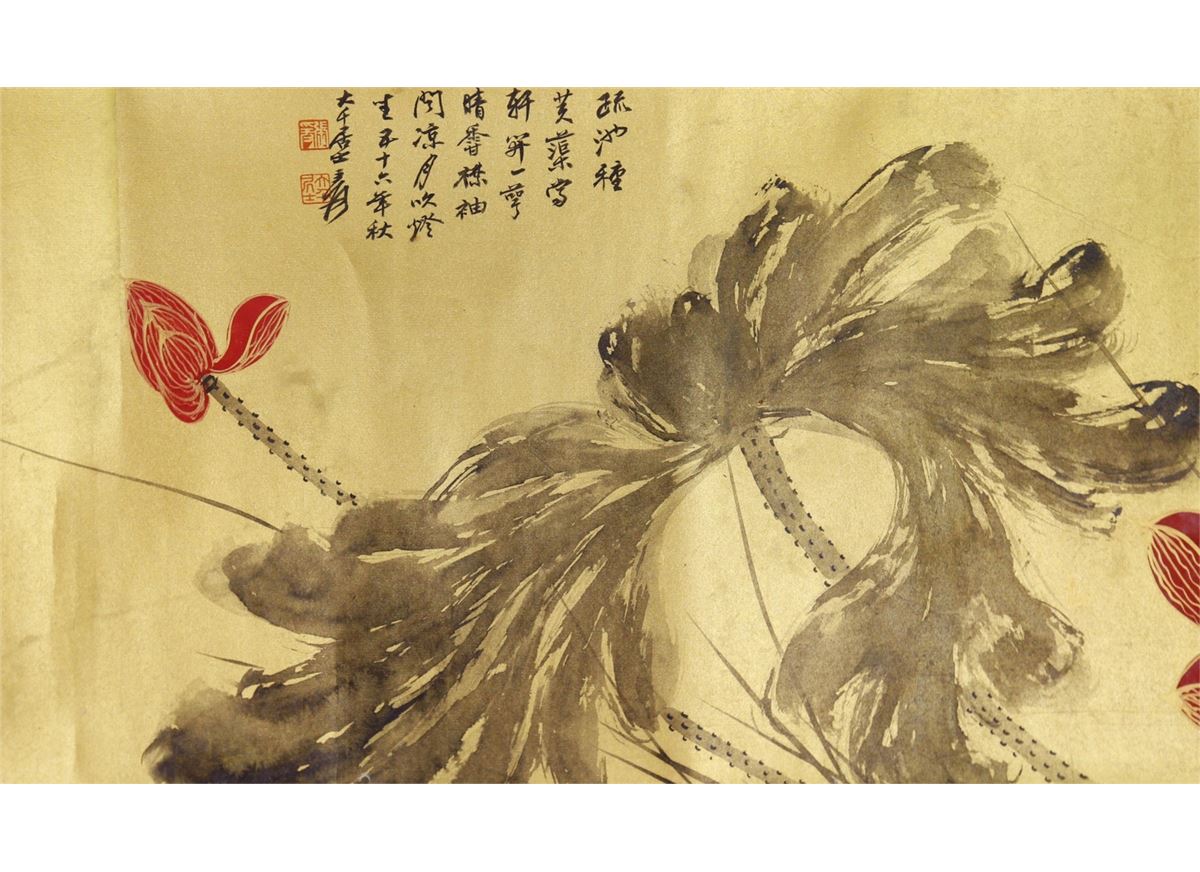 Gilt lotus; Chinese ink and watercolour on golden paper; hand scroll; signed Zhang Daqian and inscribed with two artist seals; 29.5 cm x 66cm title, 29.5 cm x 168.5 cm painting