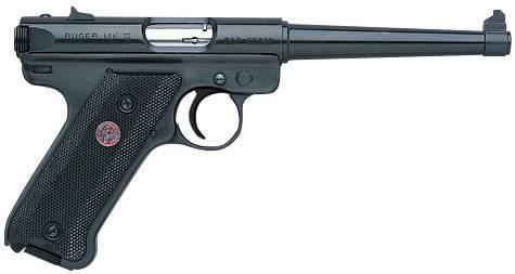 FAMILY:Mark III Series MODEL:Mark III TYPE:Semi-Auto Pistol ACTION:Semi-Auto FINISH:Blue STOCK/FRAME:Alloy Frame CALIBER/GAUGE:22 LR CAPACITY:10+1 # OF MAGS:2 MAGAZINE DESC:10 rd. BARREL:6" OVERALL LENGTH:10.25 RATE-OF-TWIST:1-in-16" SIGHTS:Fixed SAFETY:Frame Mounted GUN CASE:Plastic