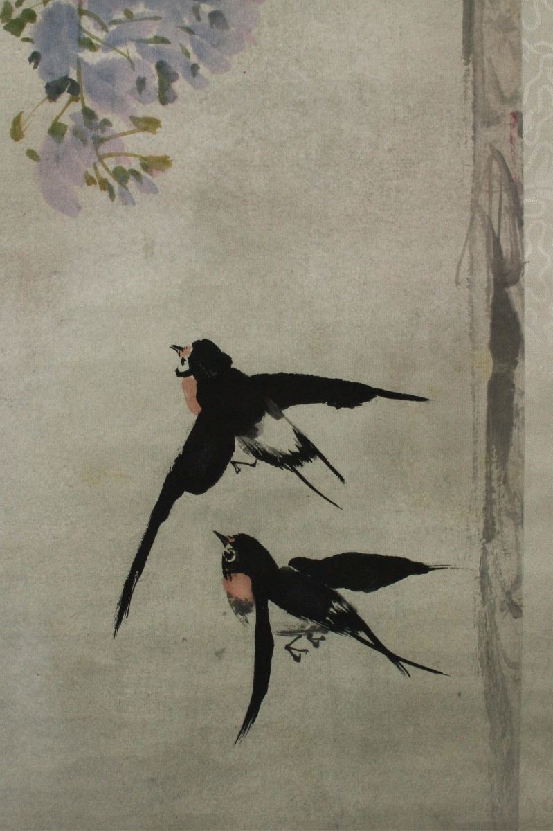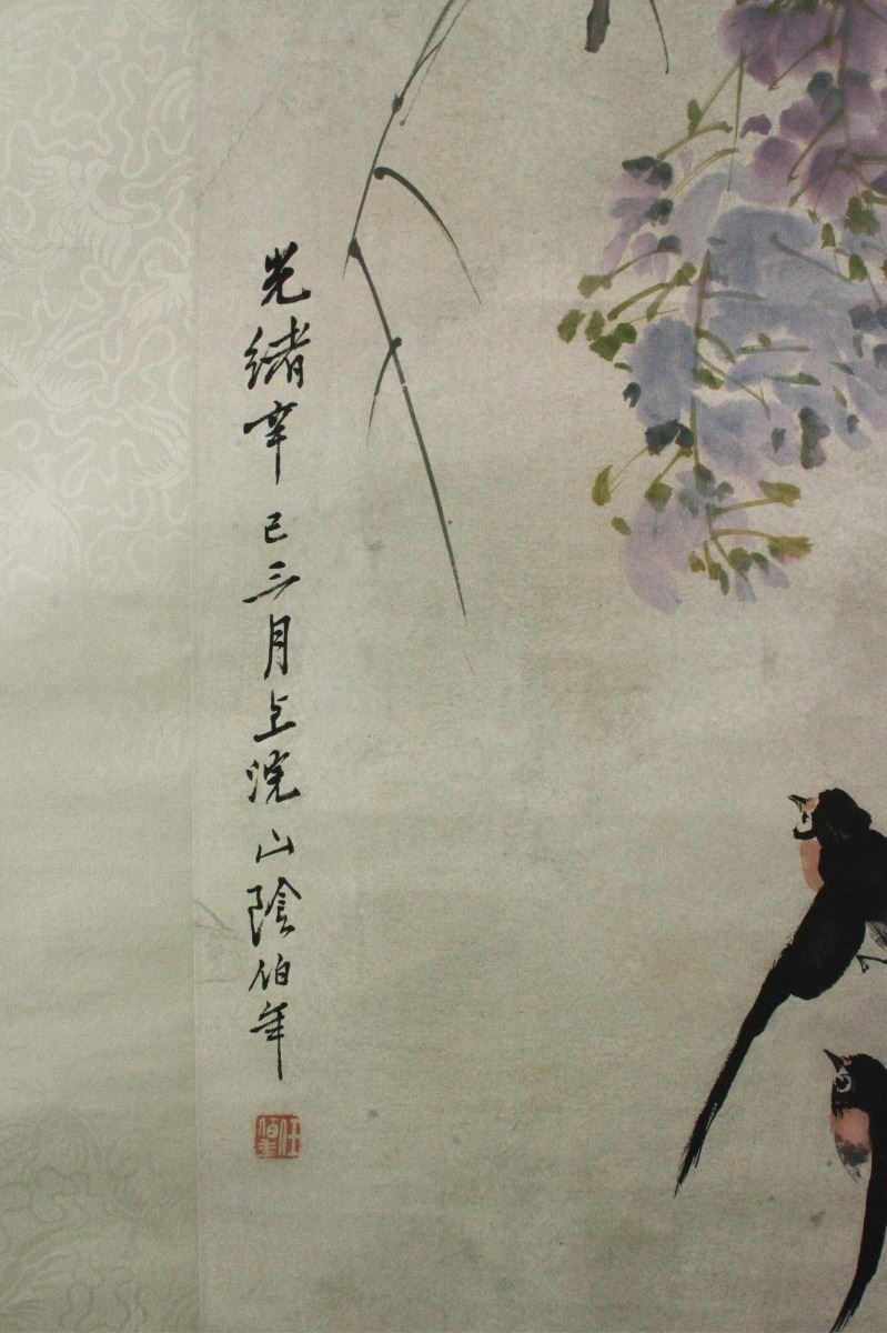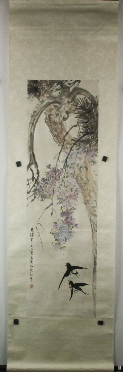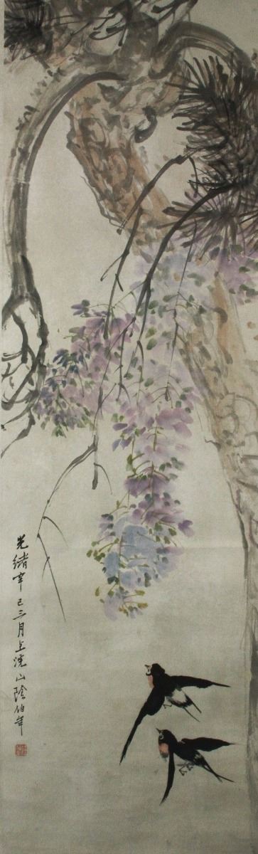 Swallows and pine tree; Chinese ink and watercolour on paper; hanging scroll; signed Ren Bonian and inscribed with an artist seal; 178 cm X 50 cm
