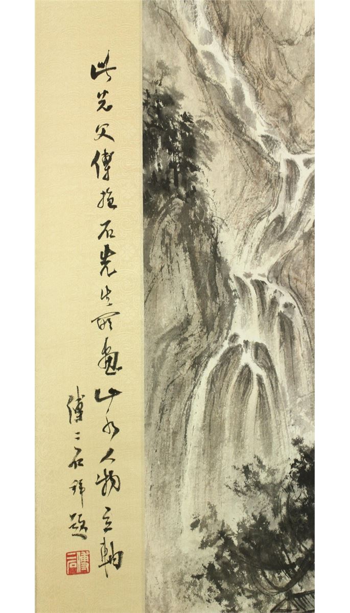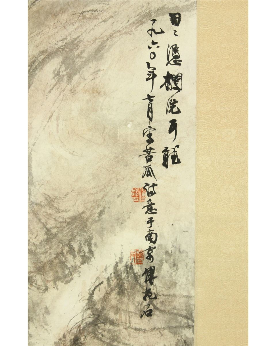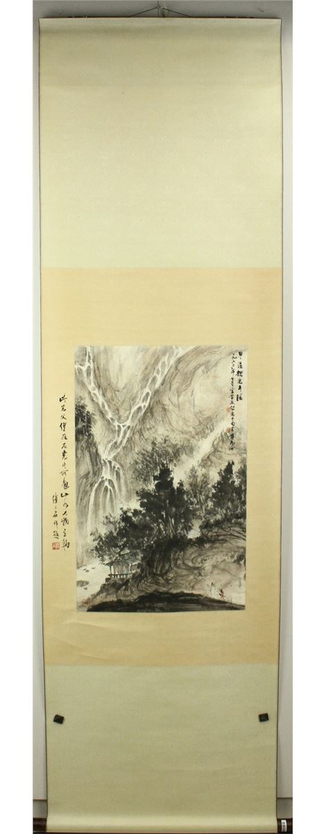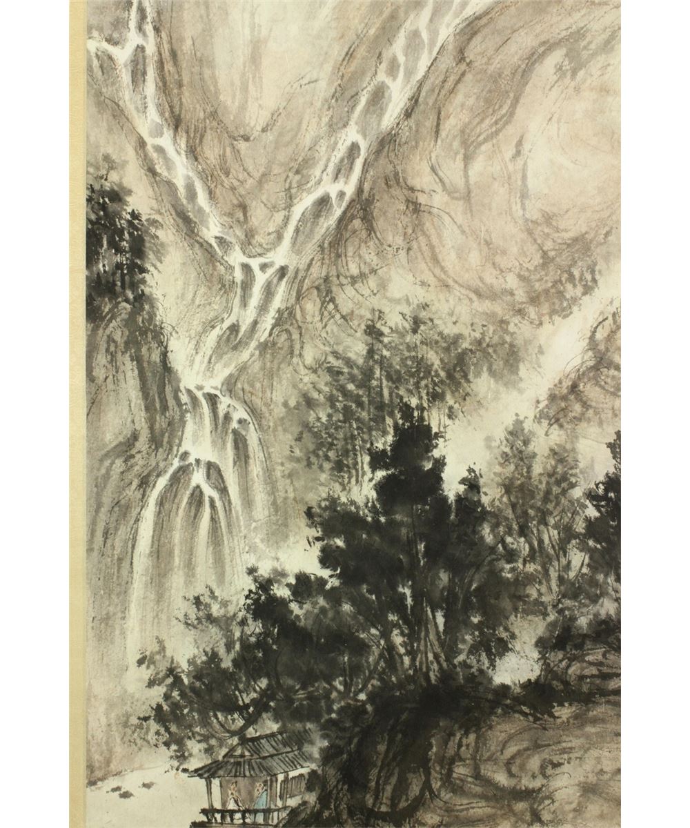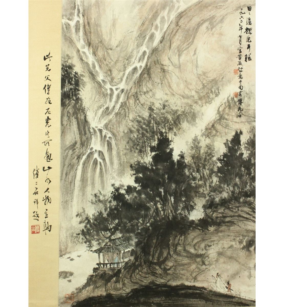 Landscape and scholars; hanging scroll; Chinese ink and watercolour on paper; signed Fu Baoshi with calligraphy and inscribed with three seals; 70 cm X 45 cm