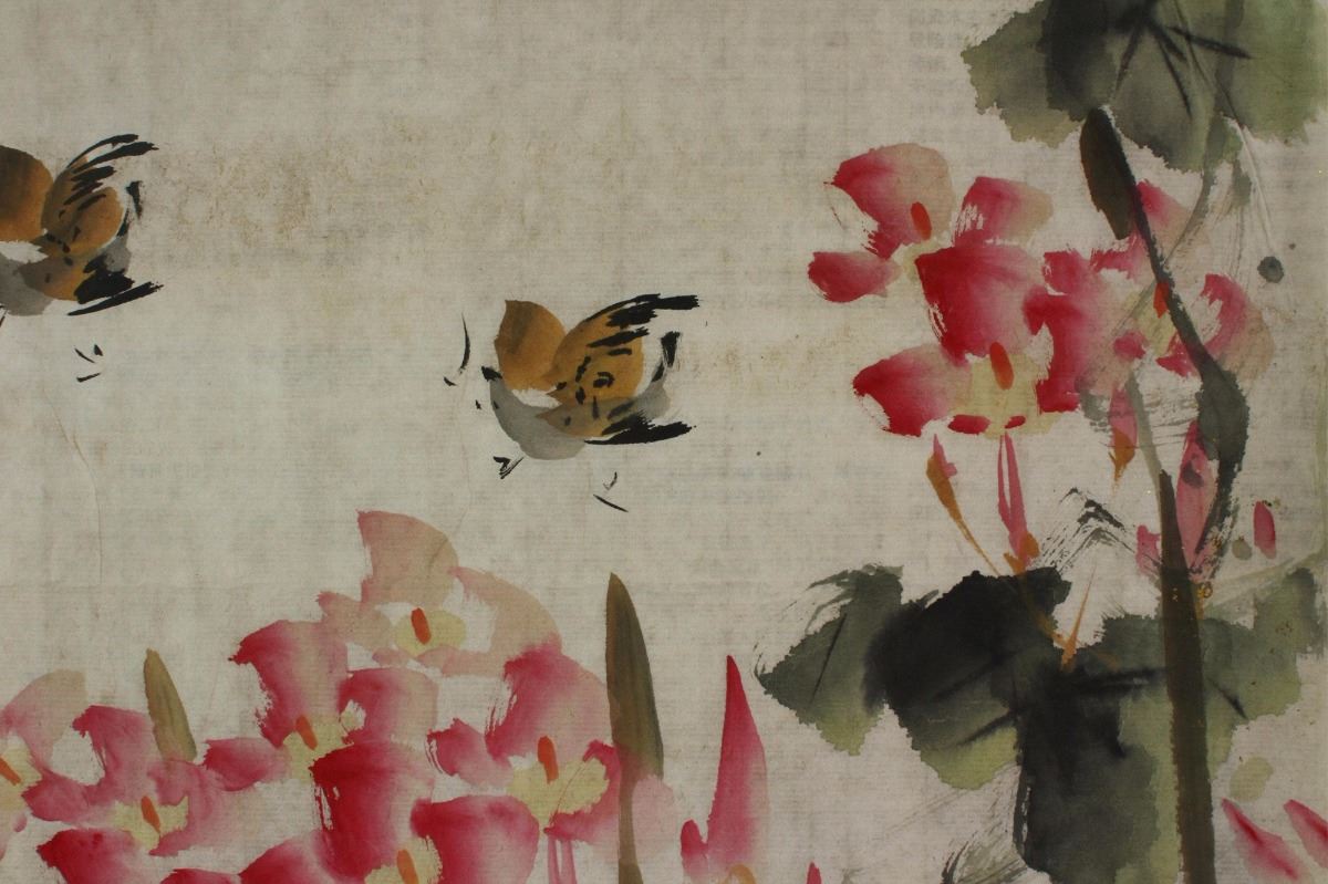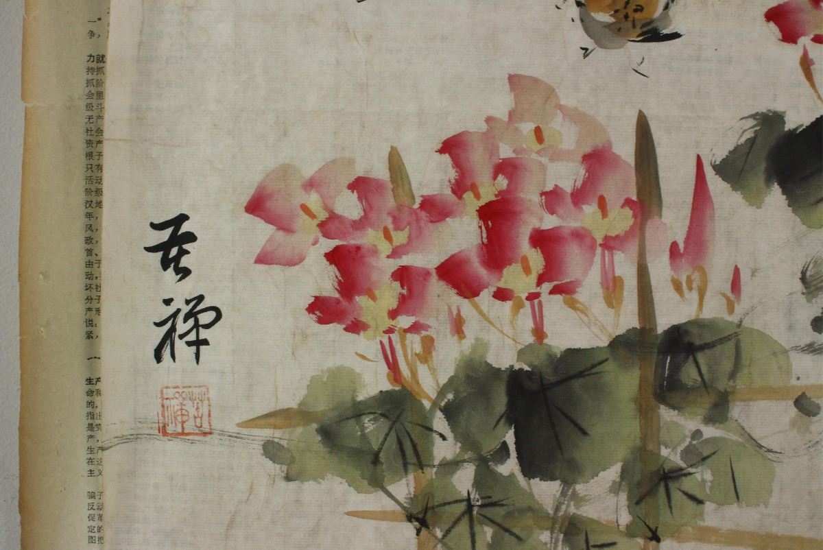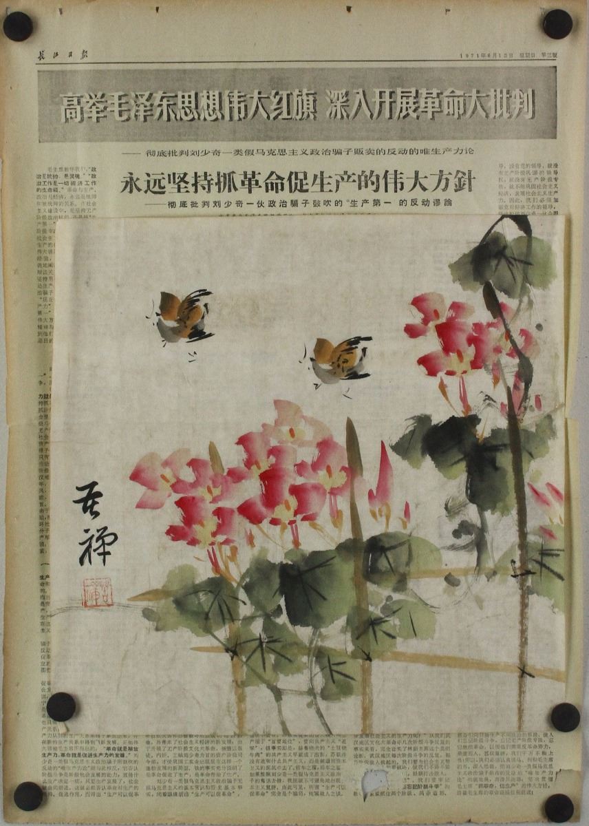 Lotus and Mandarin ducks; along with 1971 newspaper; Chinese ink and watercolour on paper; signed Li Kuchan and inscribed with an artist seal; 35 cm X 34.5 cm