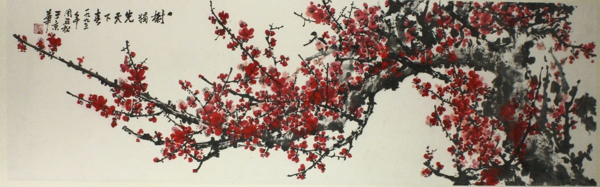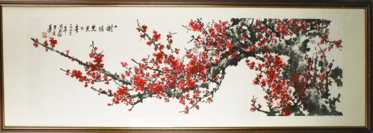 Plum blossom branches; Chinese ink and watercolor on paper; framed; signed Zhou Shisong (1951-) and inscribed with one artist seal; 123 cm X 63 cm