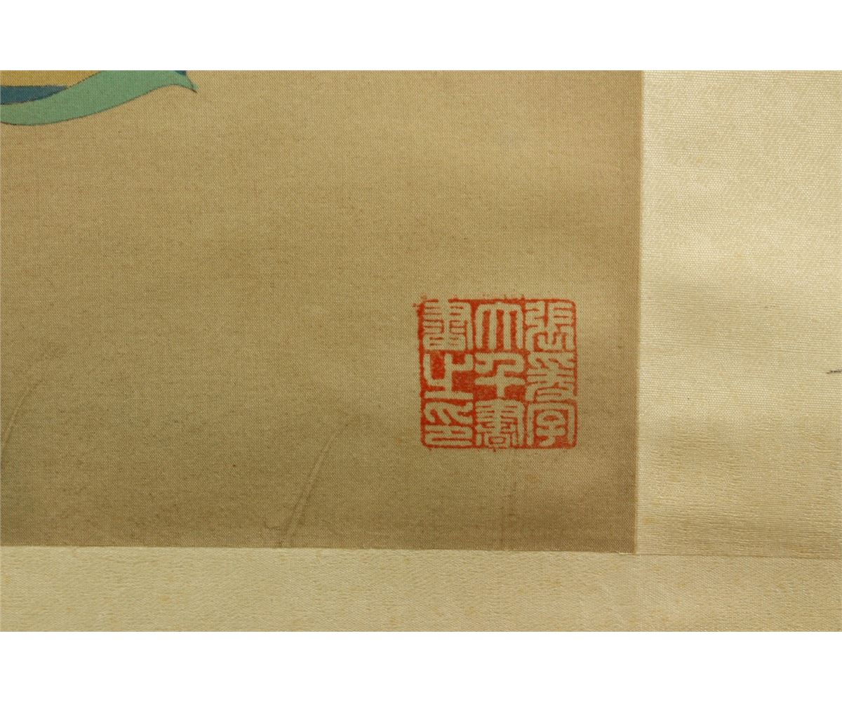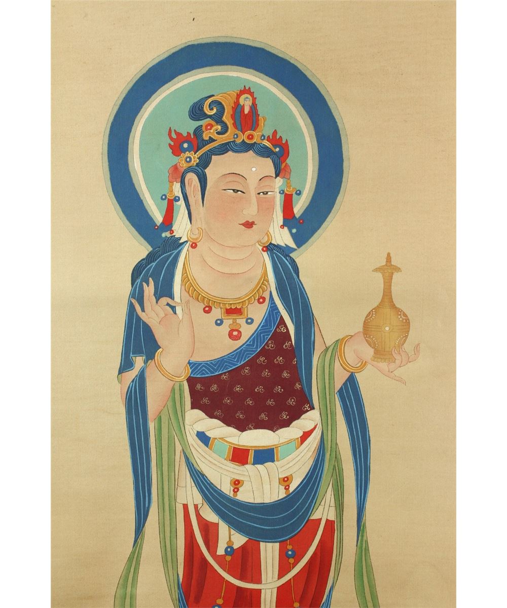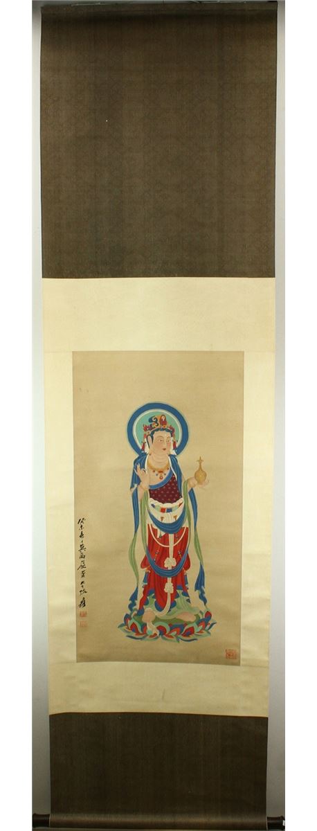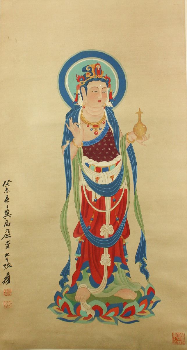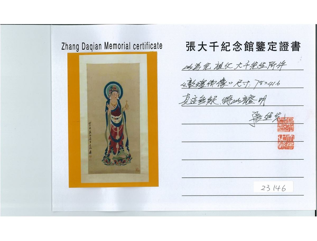 Portrait of standing Guanyin; Chinese ink and watercolour on paper; signed Zhang Daqian and inscribed with three artist seal; accompanied with certificate by Zhang Jinguang; 78 cm X 41.6 cm