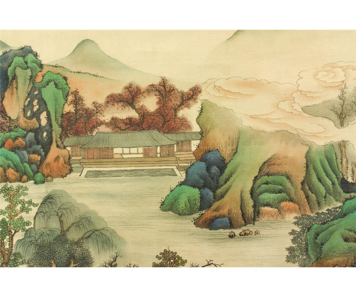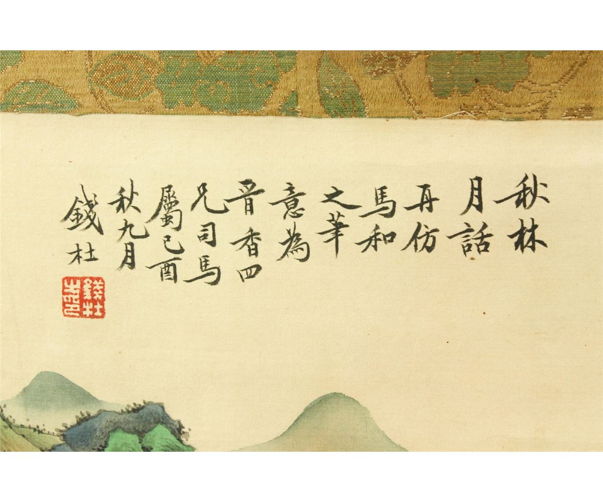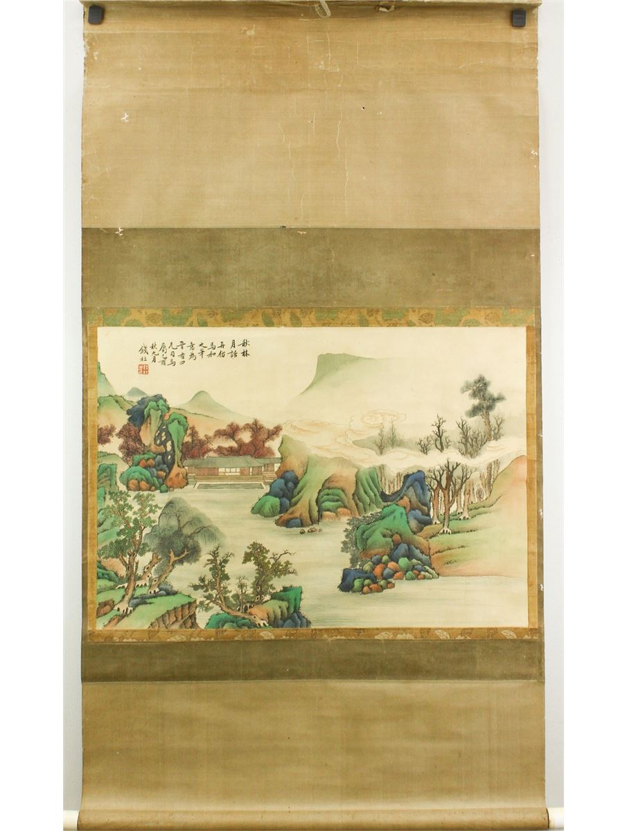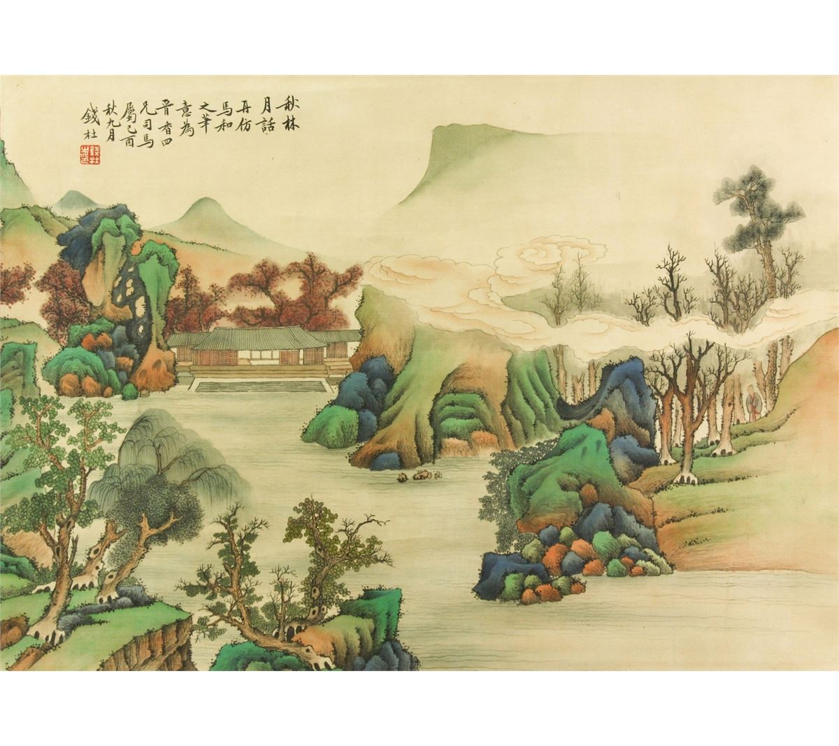 Landscape in green and blue paint; Chinese ink and watercolour on paper; hanging scroll; signed Qian Du and inscribed with one aritst seal; 44 cm X 63.5 cm