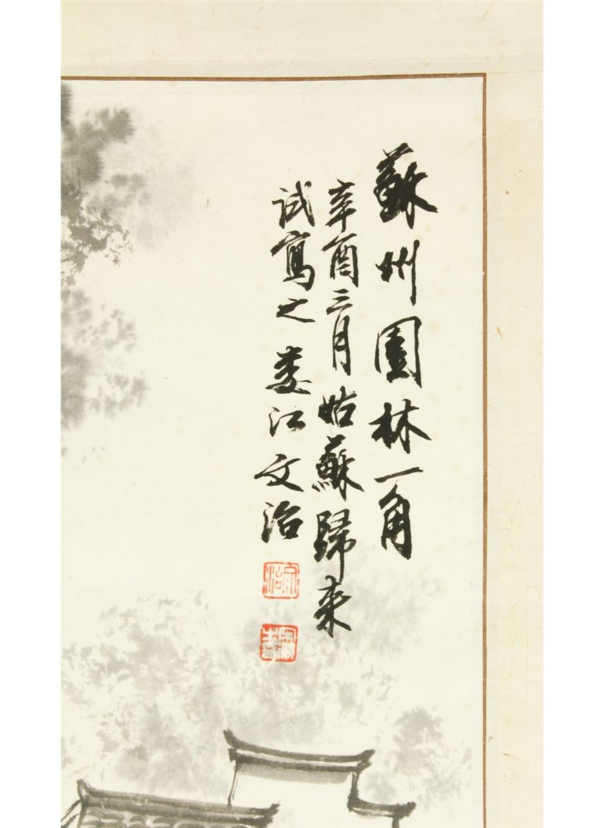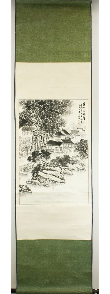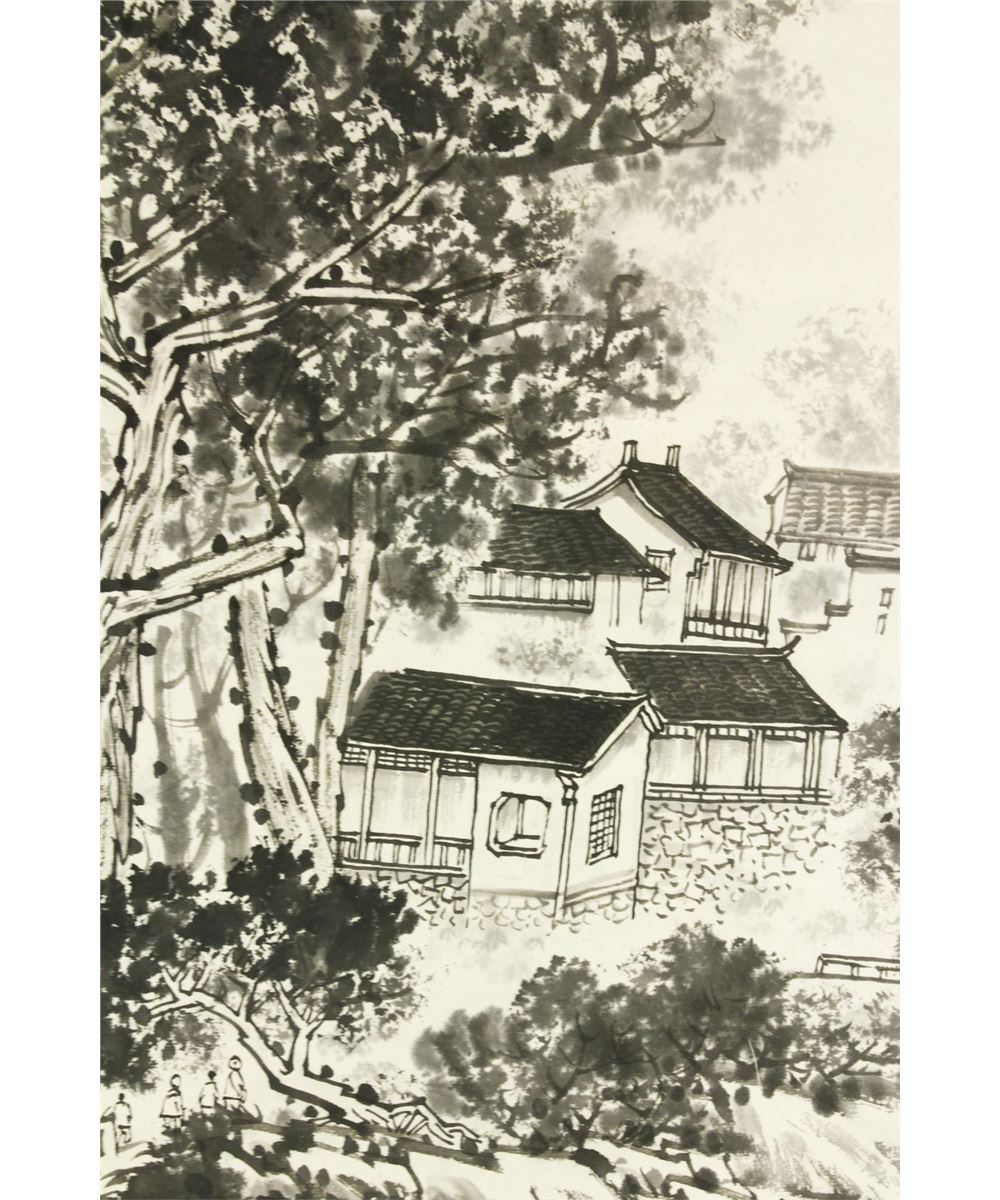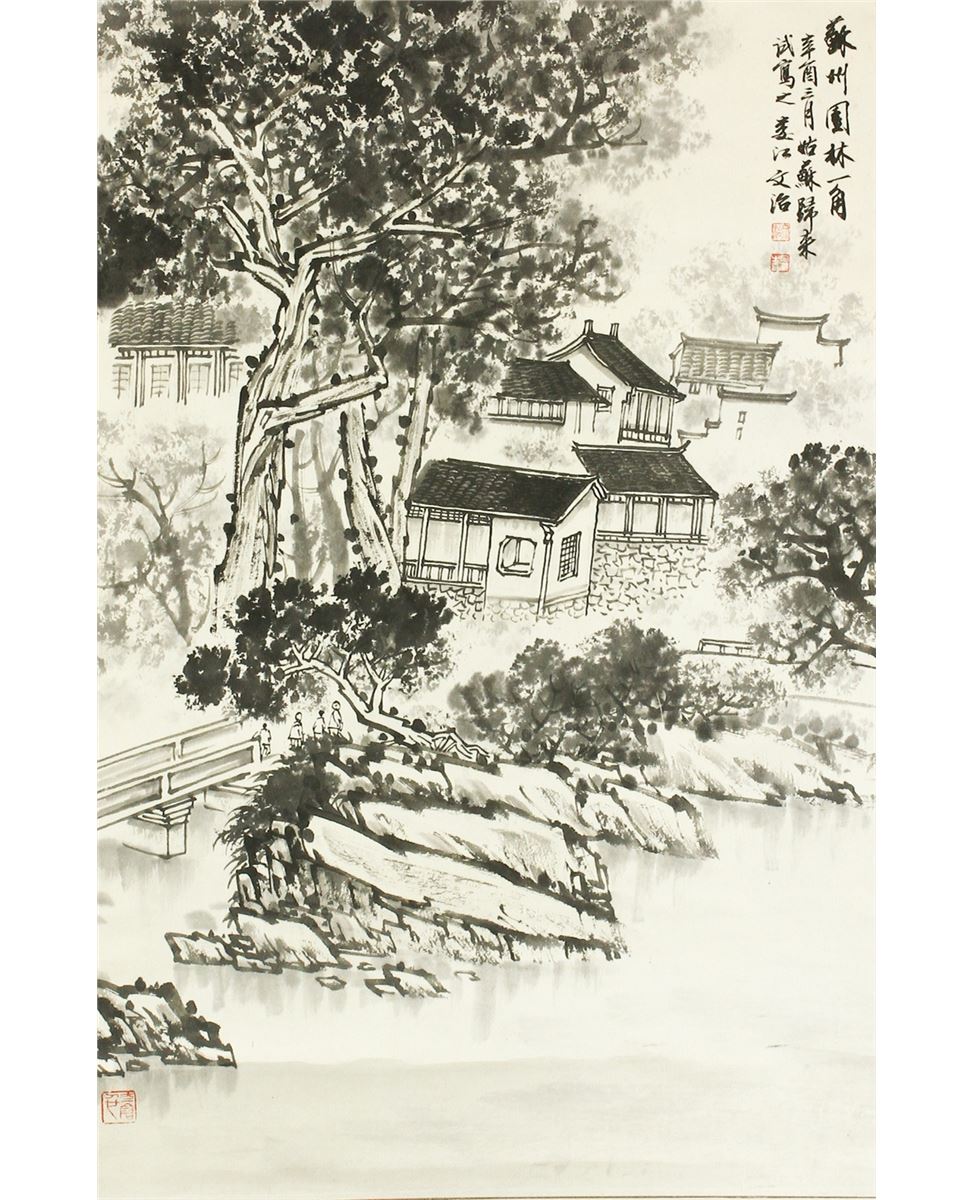 Village by the riverside; Chinese ink on paper; hanging scroll; signed Song Wenzhi and inscribed with three artist seals; 67 cm X 44 cm