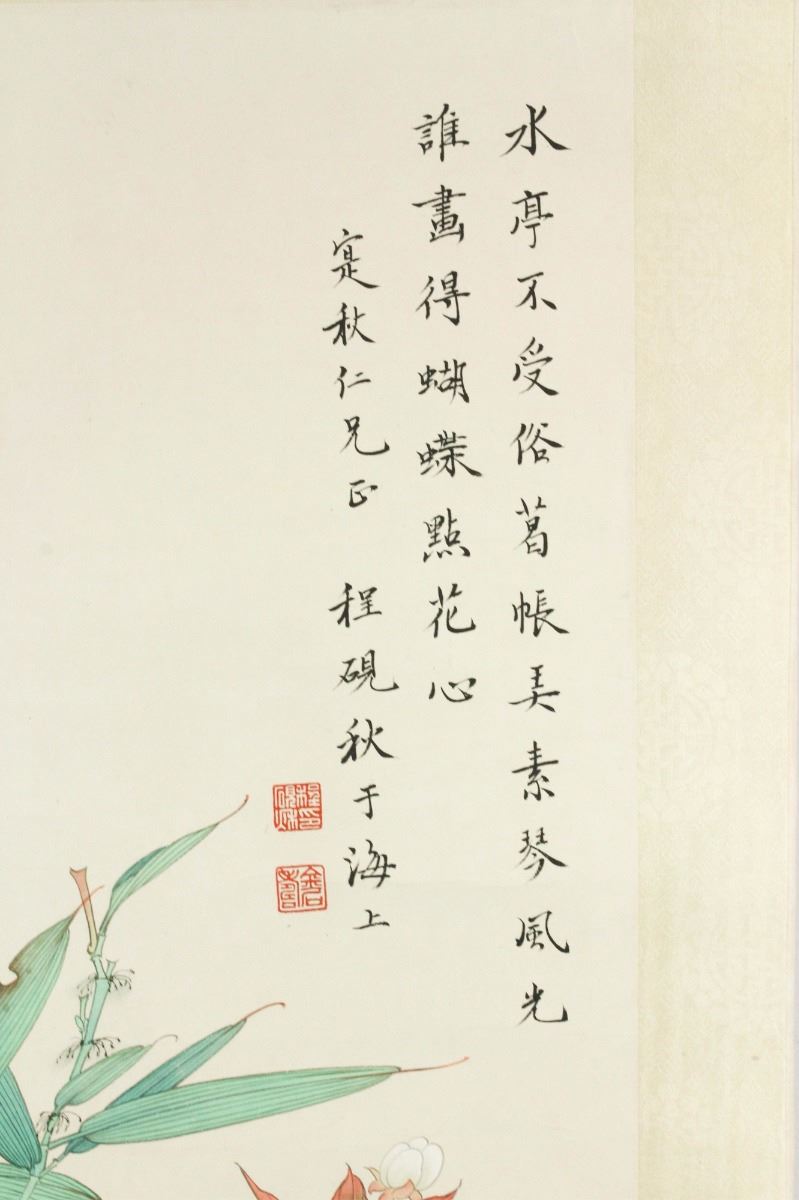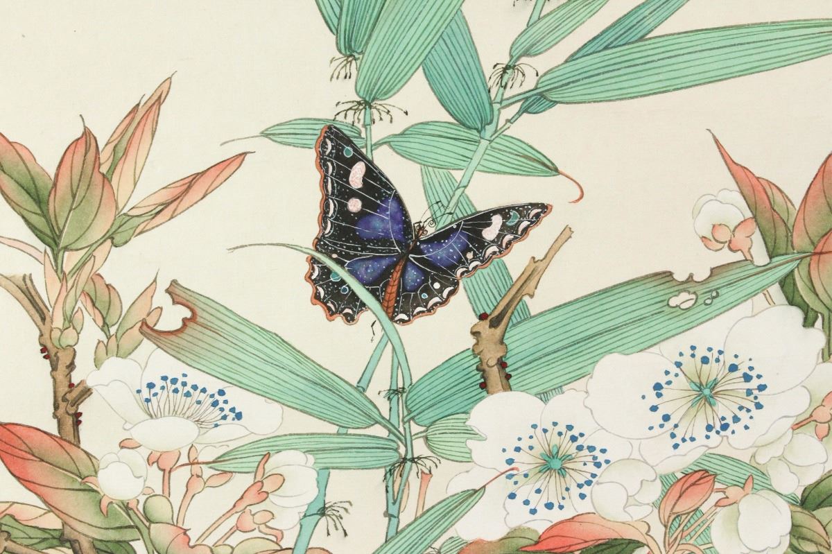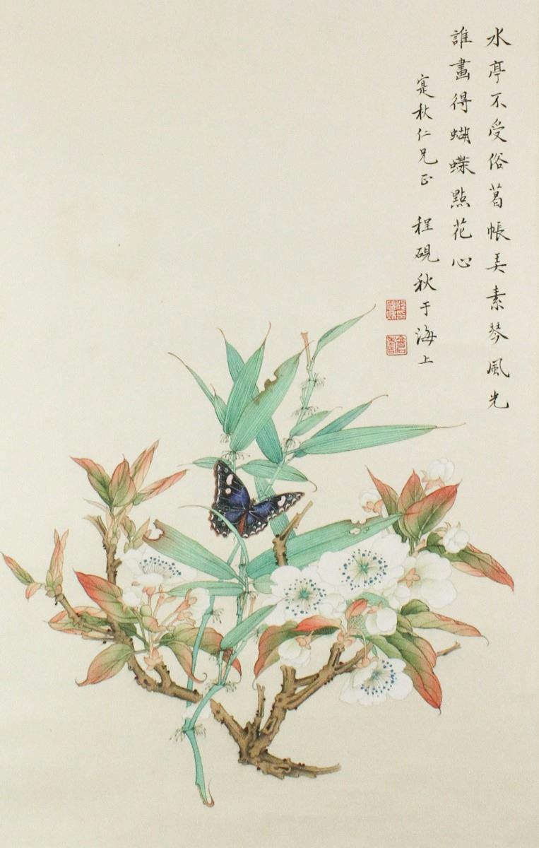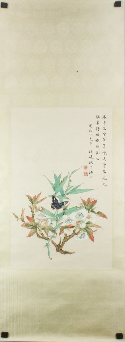 Butterfly on prunus branch; Chinese ink and watercolour on paper; hanging scroll; signed Chen Yanqiu and inscribed with two artist seals; 132 cm X 49 cm