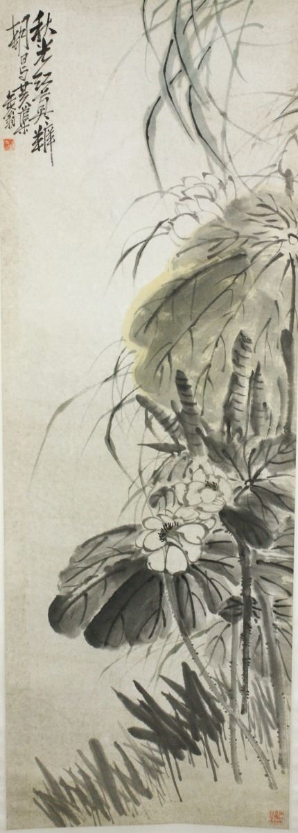 White lotus; Chinese ink on paper; hanging scroll; signed Wu Changshuo and inscribed with two artist seals; 135 cm X 47.5 cm