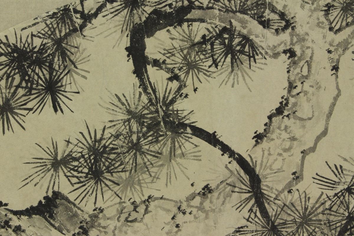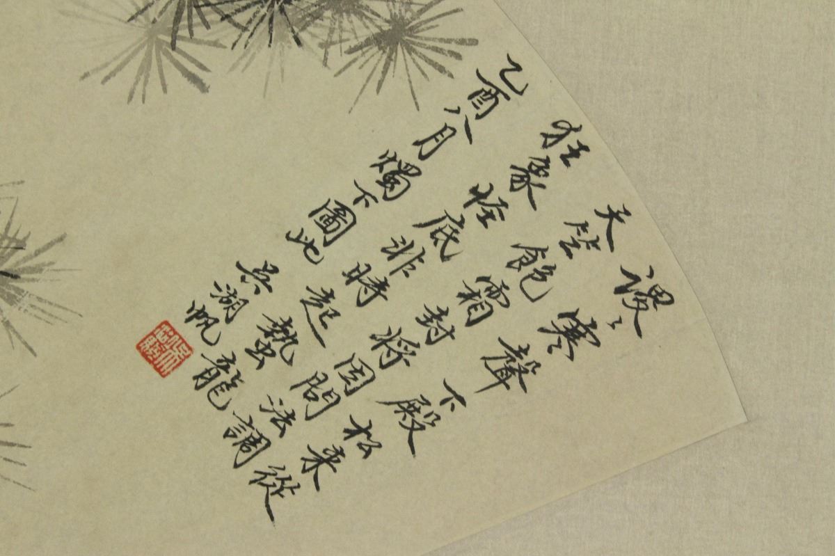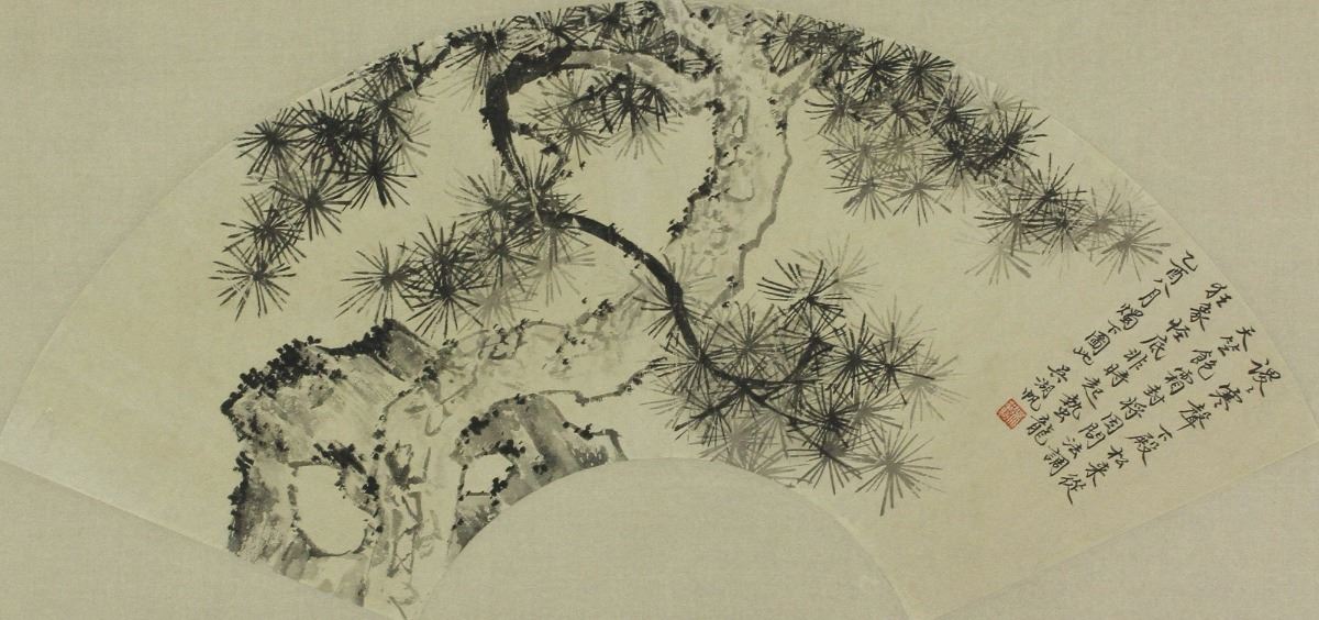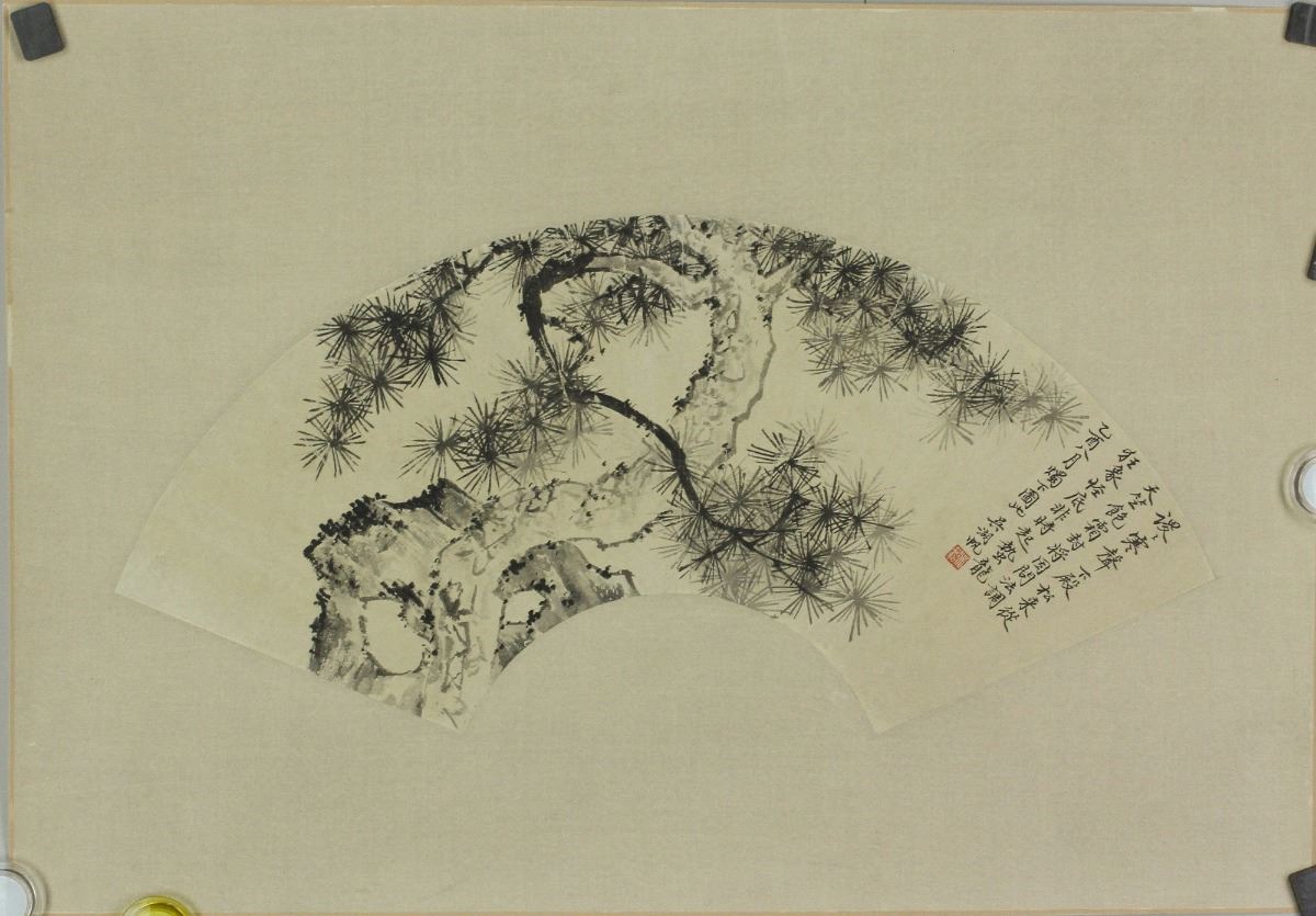Pine tree on rock; Chinese ink on fan paper; signed Wu Hufan and inscribed with one artist seal; 66 cm x 45 cm