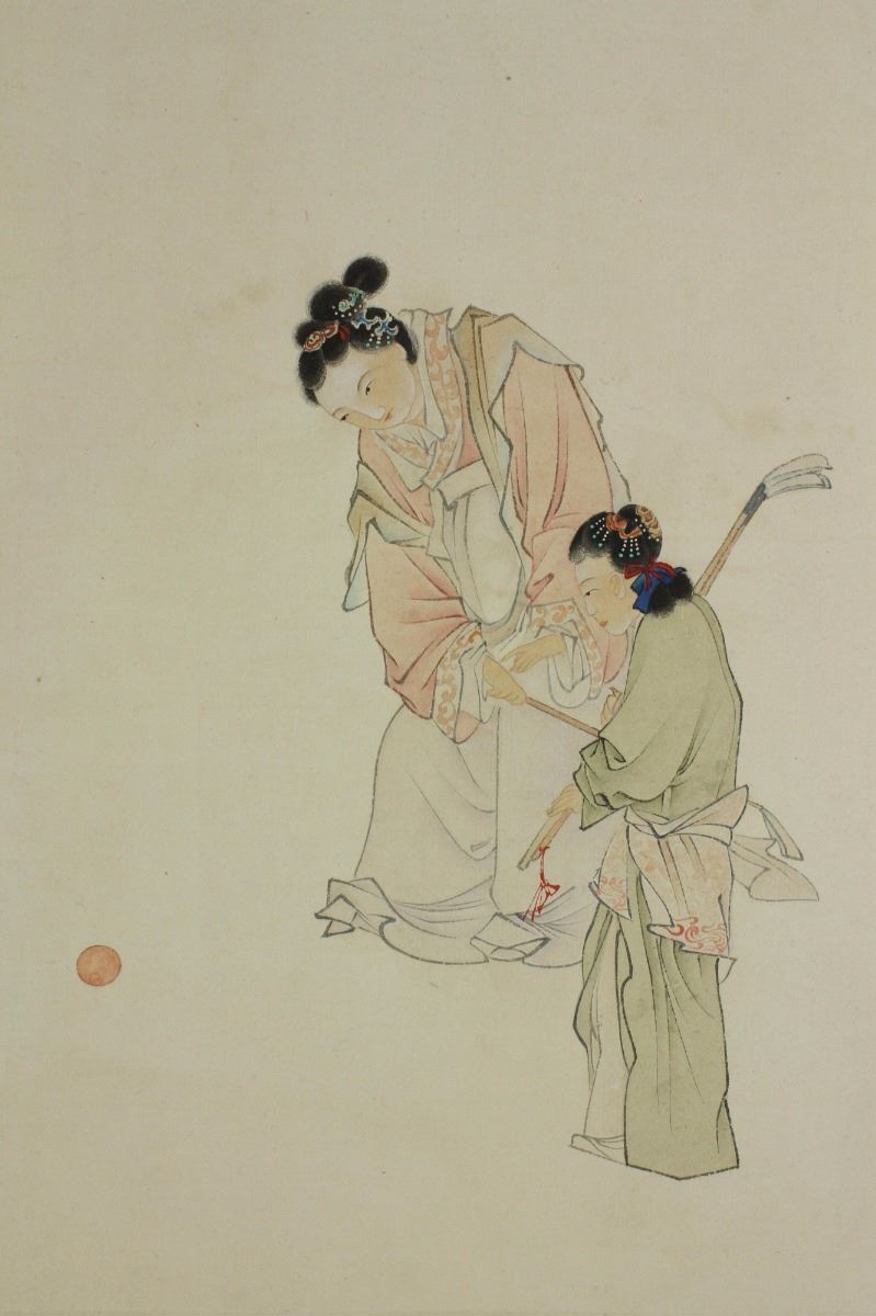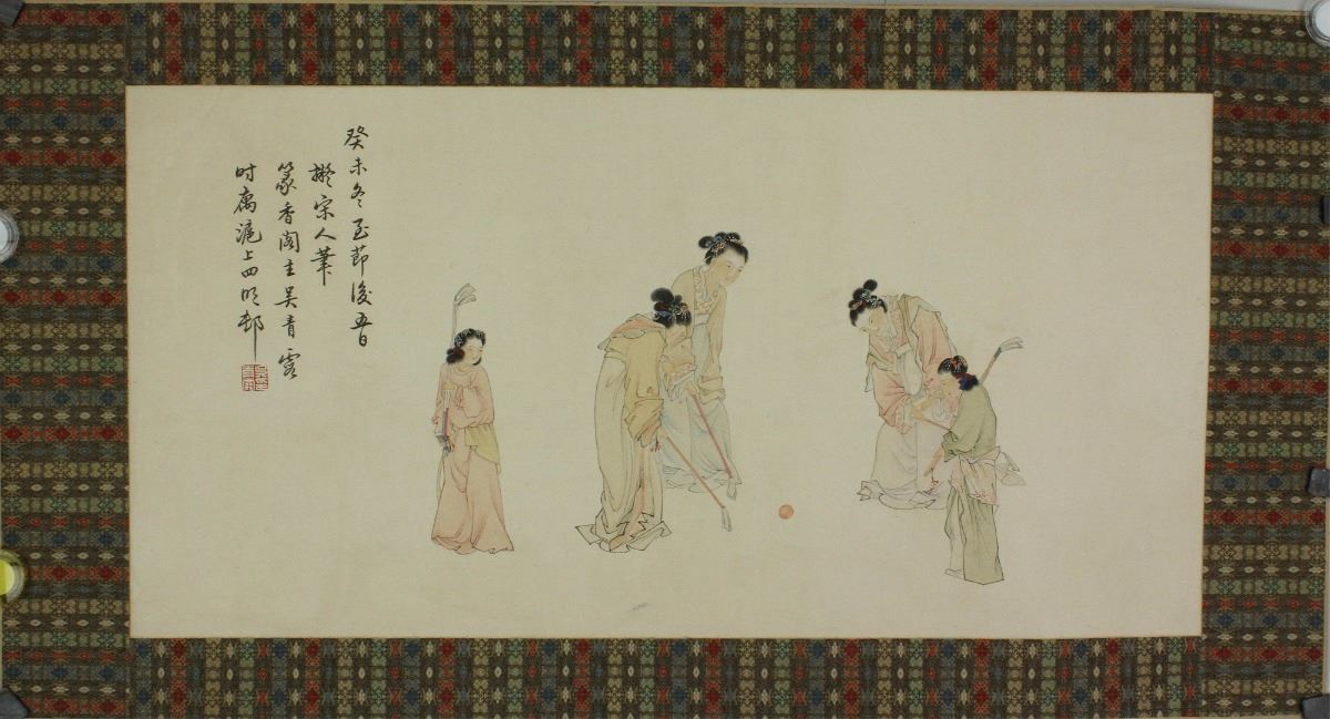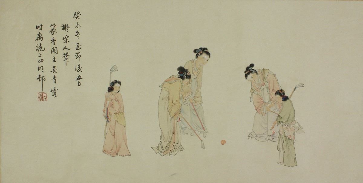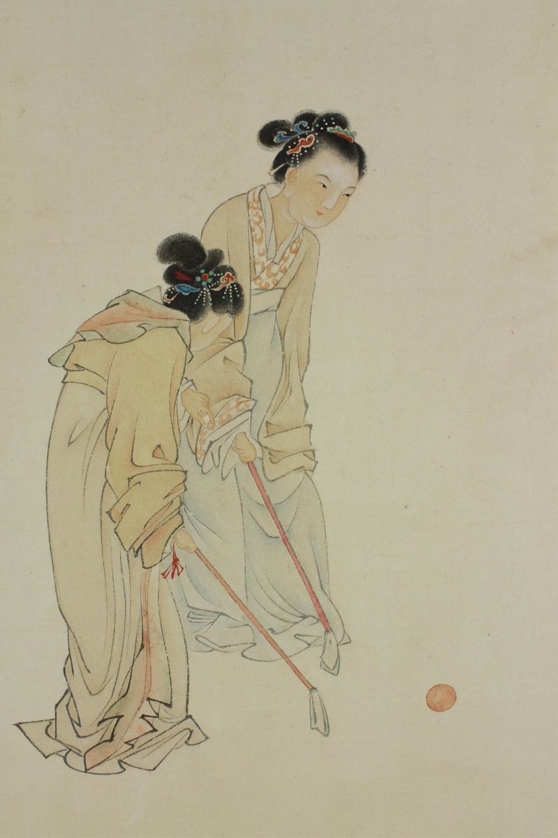 Women playing Chuiwan; Chinese ink and watercolour on paper; signed Wu Qinwan and inscribed with one artist seal; 76.5 cm x 38.5 cm