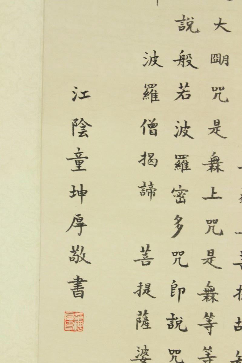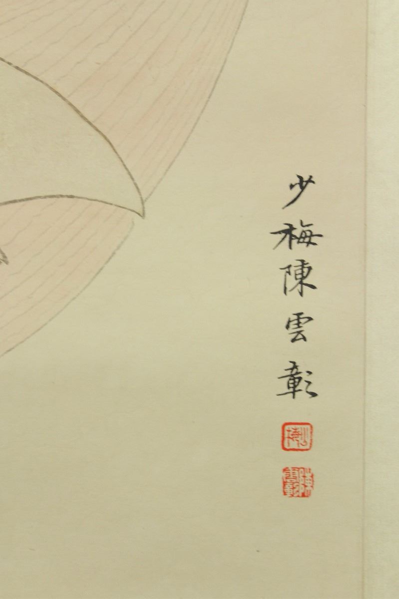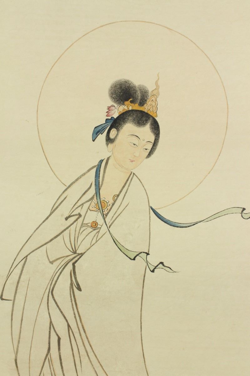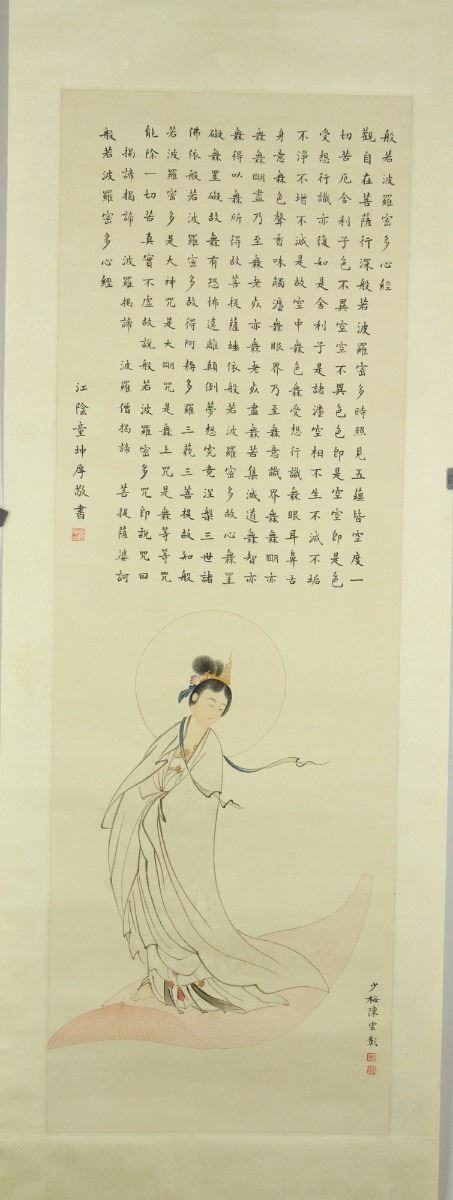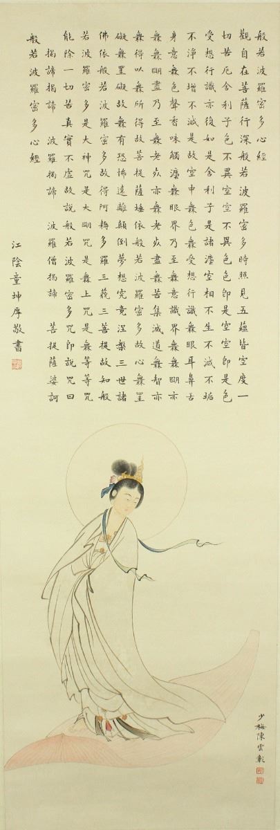 Guanyin figure with script calligraphy; Chinese ink and watercolour on paper; hanging scroll; signed Chen Shaomei and inscribed with two artist seals; 118.5 cm x 39.5 cm