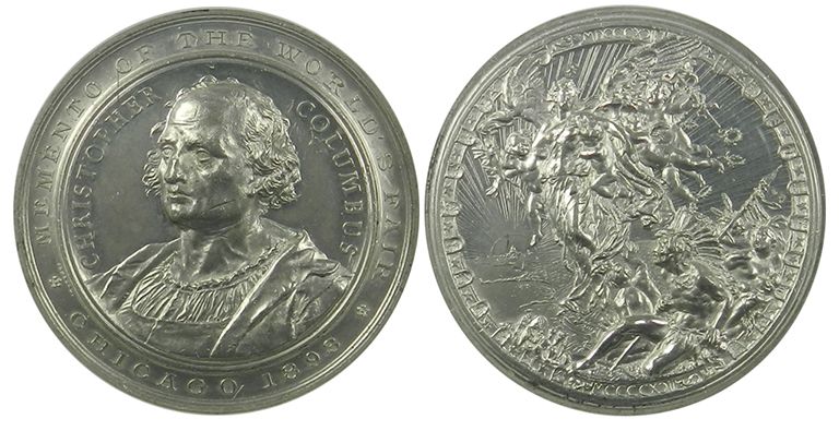 Columbus-Civilization, 1893. WM, 59mm. Eglit 105. The beautiful Italian high art design of Pagliaghi and Cappucio, struck by Stephano Johnson in Milan. NGC MS62 in a custom oversized holder.