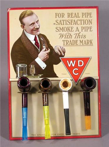 WDC Tin Pipe Display, cardboard, easel back with four pipes. Excellent condition. 9 1/2 X 13 inches.