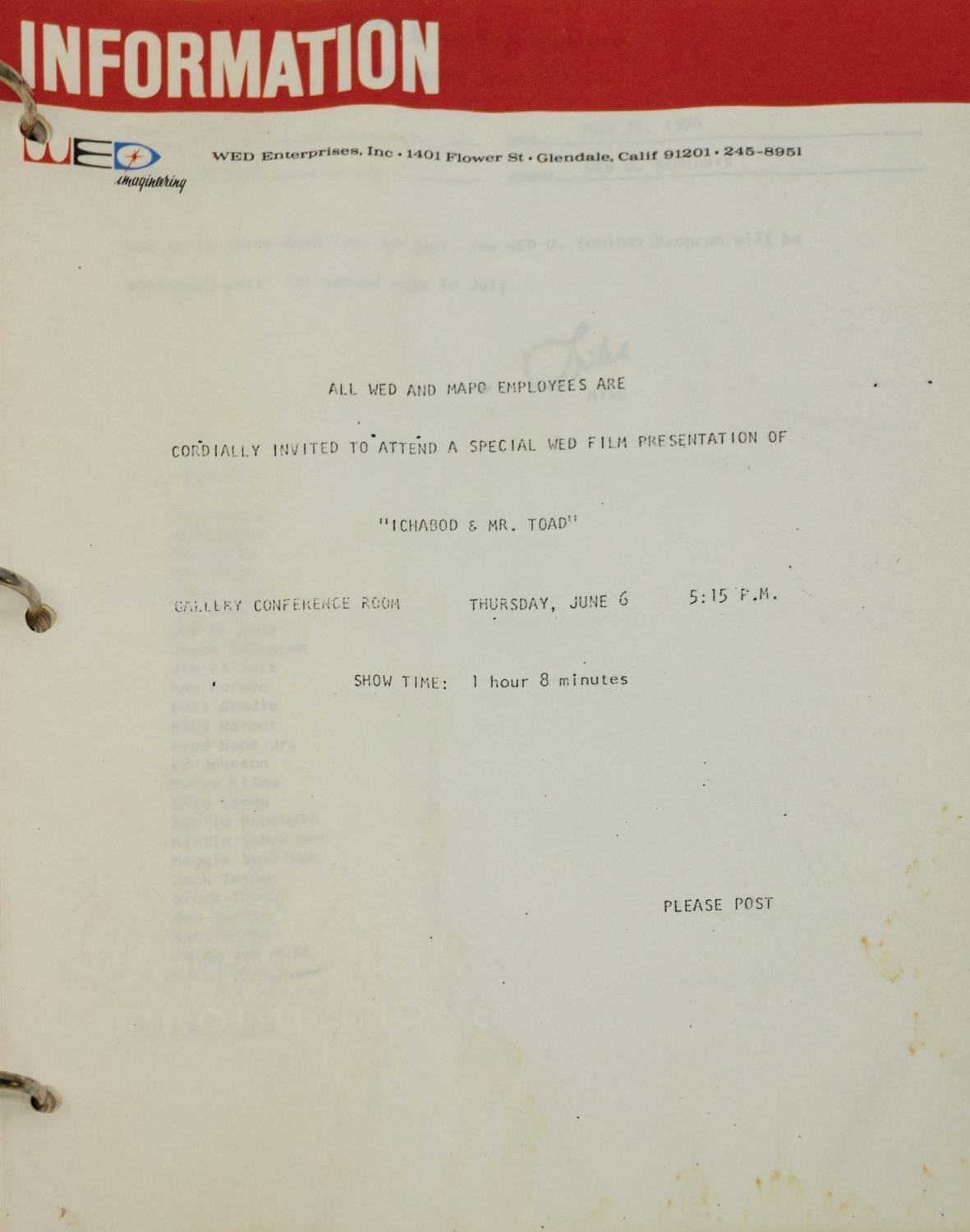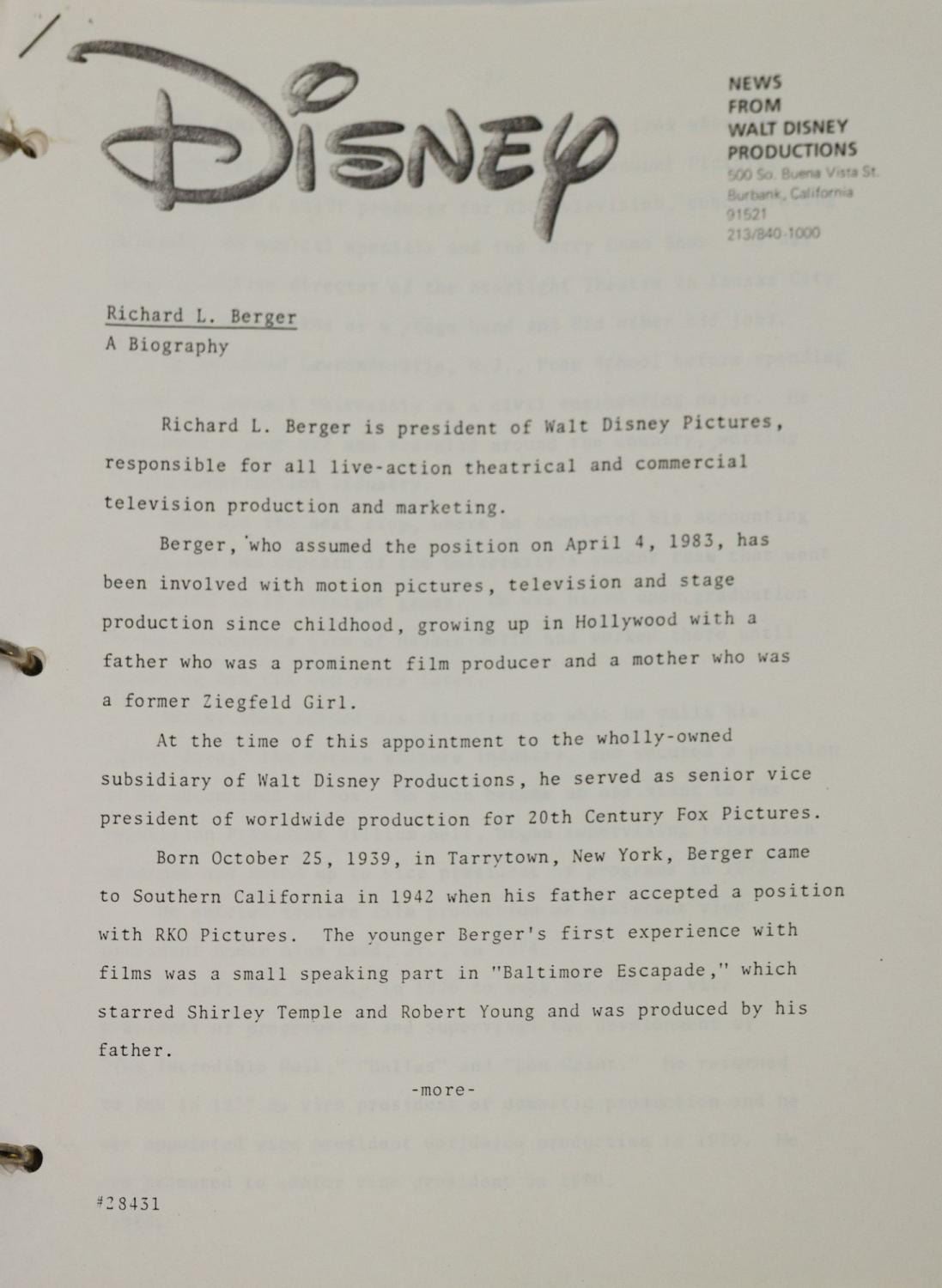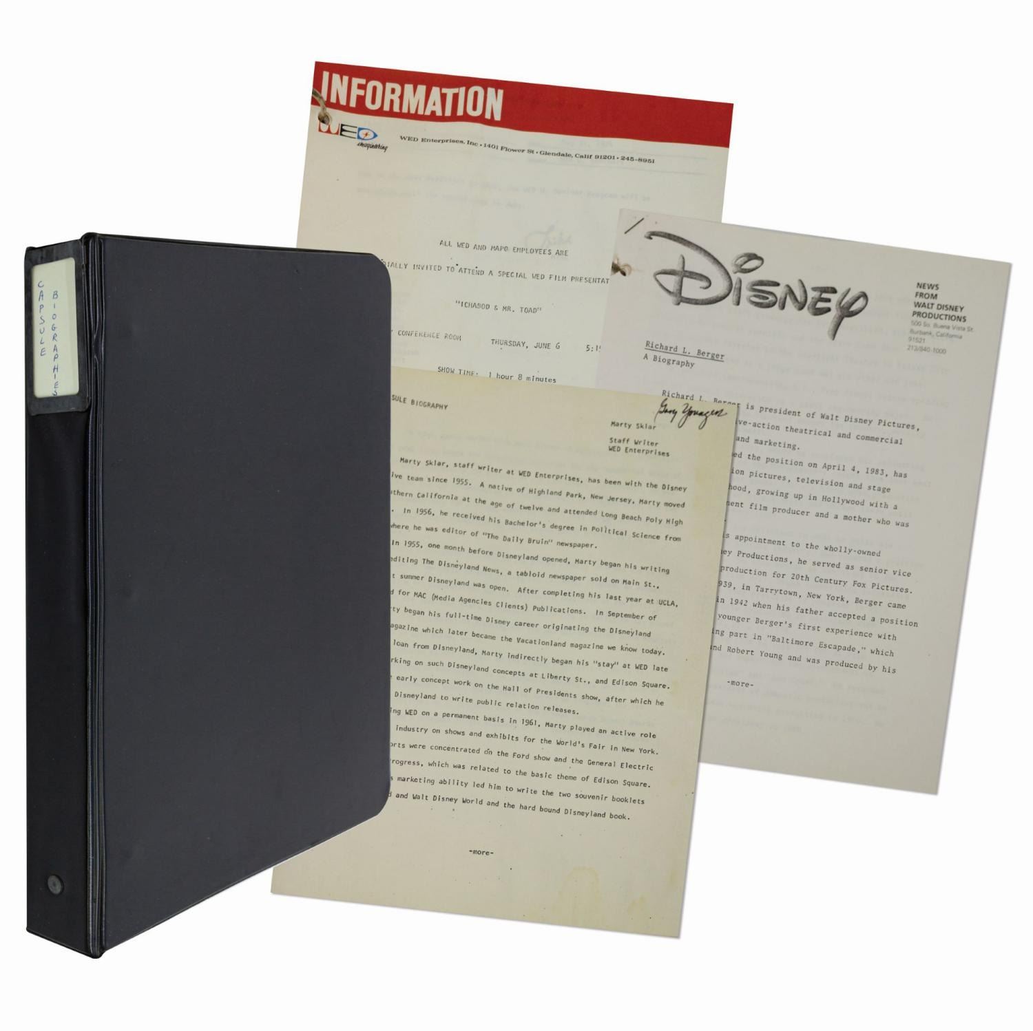 (WDI/WDP, 1970s-80s) An in-house reference binder containing 58-pages of WDP executive biographies and press releases announcing promotions at the highest levels of the company, as well as WED Imagineering and MAPO employee biographies and inter-office memos. Executives include Richard L. Berger, Barry Lorrie, Bill Brademan, and more. Among the Imagineers covered are X. Atencio, Frank Thomas, Bob Gurr, Marc Davis, Dick Irvine, and more. Gary Younger has signed off on each of the Imagineer bios in the upper right-hand corner of the page. The binder measures 11.75"x10" and 1.5" deep and is in very good condition with some surface wear. Some pages exhibit handling and damp staining/warping.