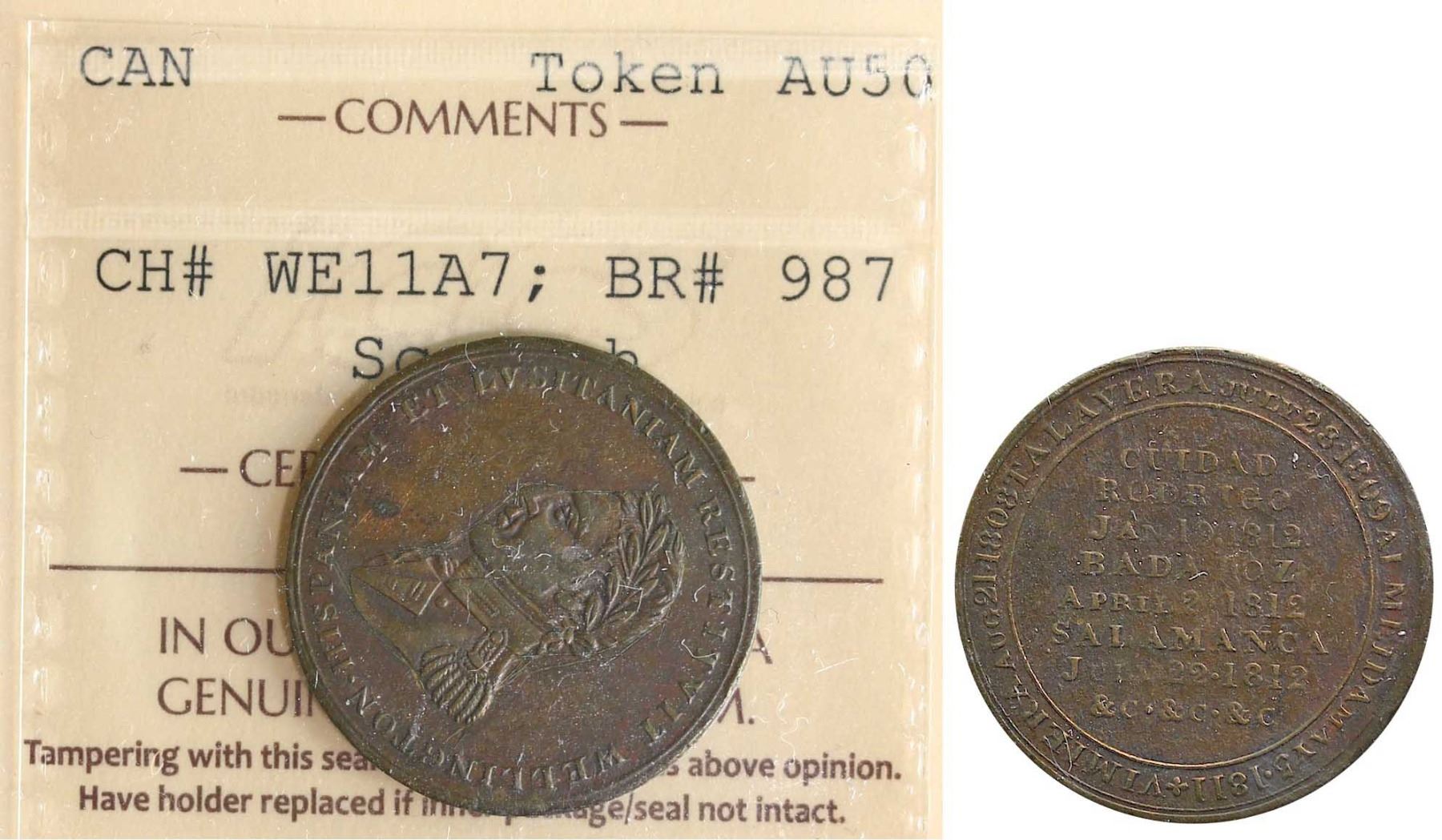 WE-11A7, Br:# 987, Rare Brass Penisular token showing Wellington, ICCS AU-50 and scratched.