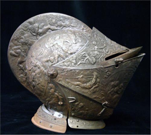 VISIRHJÄLM, GJUTGODS, RELIEFDEKOR AV BAROCKFIGURER, TROLIGEN HUSQVARNA, 1800-TALETS SENARE DEL, H30, B37 (SMÄRRE KOMPLETTERINGAR)