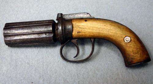 SLAGLÅSREVOLVER, S.K PEPPERBOX, 6 PIPOR, KOLV I TRÄ, 1800-TAL, L20 (OBETYDLIGA SKADOR)