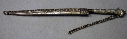 KNIV, SKAFT OCH BALJA AV SILVER, BLADET MED GULDINLÄGGNINGAR, RIK BLOMDEKOR, SKAFTETS AVSLUTNING I FORM AV FÅGELHUVUD, ORIENTALISK, 1800-TAL, L32