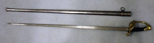 FRANSK OFFICERSSABEL, MODELL 1855, TILLVERKAD 1876, HERARD A PARIS, HANDTAG I GENOMBRUTEN MÄSSING, SVÄRTAD STÅLBALJA, L106