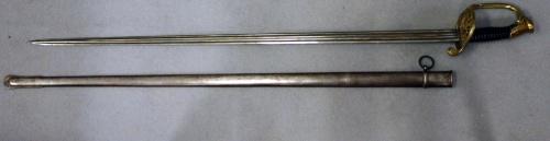 FRANSK OFFICERSSABEL, MODELL 1841, HANDTAG I GENOMBRUTEN MÄSSING, STÅLBALJA, L105