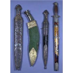 WEAPONS AND MILITARIA - A Chinese short sword, the cruciform hilt with reeded grip, the tortoiseshell covered scabbard with chased silver mounts and bands with suspension rings; two Caucasian kindjals, with embossed hilts and scabbards; a Nepalese kukri, with horn grip and gilt metal mounted velvet covered scabbard (4)