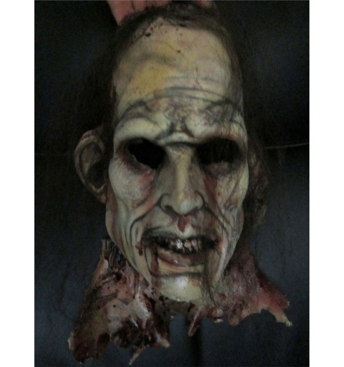 This is a wearable mask of a rotten Zombie with hanging flesh.