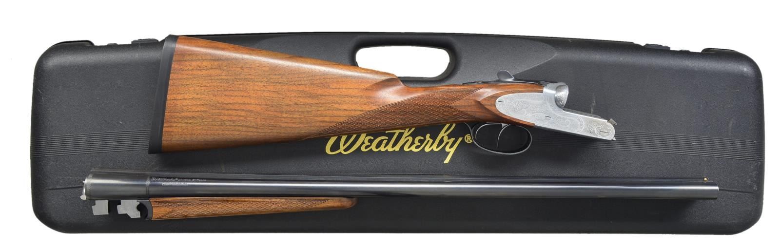 SHOTGUN. Cal. 20 Ga. S# FS1151. Bbls. 26". Made w/ slightly raised matted rib are between 2005 & 2011 by Fausti. This gun has 26" bbls. fitted w/ interchangeable choke tubes. Gauge, retailer, model & Weatherby address along w/ “MADE IN ITALY” are stamped on tops of bbls. fitted w/ slightly raised, flat matted rib. Engine turned bbl. flats stamped w/ Italian nitro proofs. Coin finished side plated boxlock action features non automatic safety & dbl. triggers. Action & lockplates are laser engraved w/ near full coverage rose & scroll around scrolling ribbons. Straight grip buttstock of lightly streaked & figured European walnut is laser checkered in “Scottish style”. Matching splinter ejector forend has Anson type release. DAH: 2 1/4". DAC: 1 1/2". Cast: 0. WEIGHT: 6 lbs. 4oz. UNATTACHED ACCESSORIES: ABS Weatherby marked case lined in padded burgundy cloth. Contains bags for bbls. & action, owner’s manual, 2 choke tubes & installation tool (2 choke tubes in gun for a total of 4). CONDITION: very fine, close to “as new” w/ only 1 or 2 of the slightest handling & assembly marks on all surfaces. Mechanically crisp. (21-1592/MGM). MODERN. $1,750-2,500.