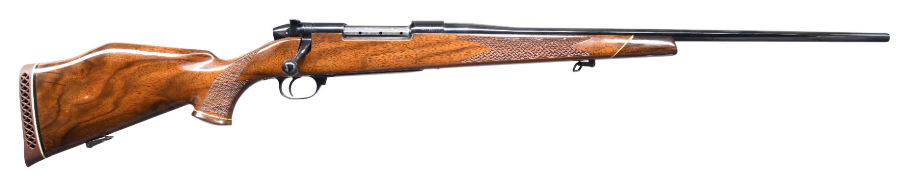 Cal. 300 Wby Mag. S# H66853. Bbl. 24". Rifle lacks sights but is factory drilled & tapped for scope mounting. Japanese made MKV Weatherby bolt action rifle. Blued finish. Checkered pistol grip walnut Monte Carlo stock with bottom mounted sling swivels & factory recoil pad. LOP: 13 1/4". CONDITION: stock shows some light flaking varnish & scattered handling marks. Metal retains 98% blue with some light freckling & handling marks. Action functions properly when hand cycled. Very good bright bore. (25-1493/MJC). MODERN. $800-1200.