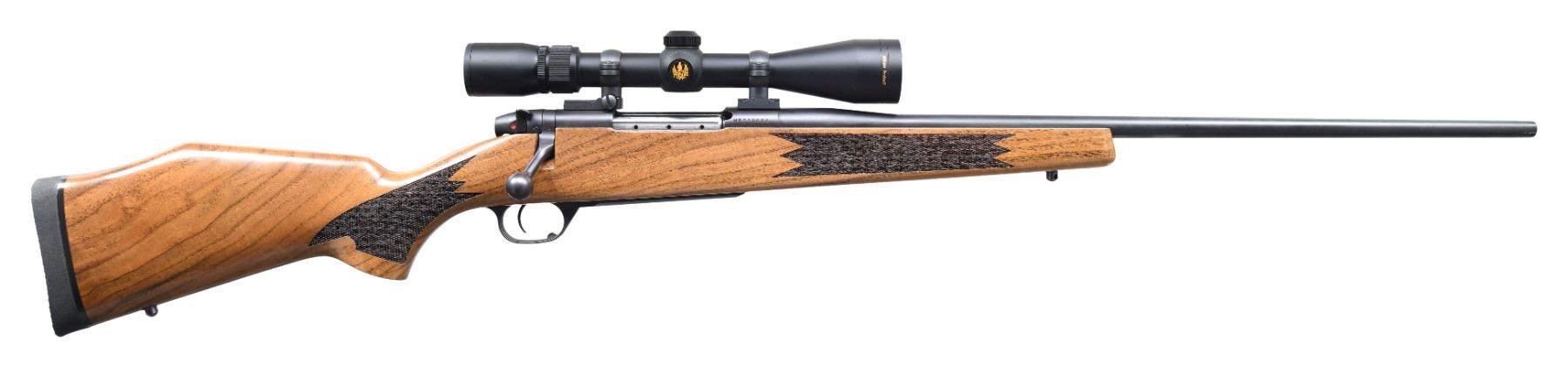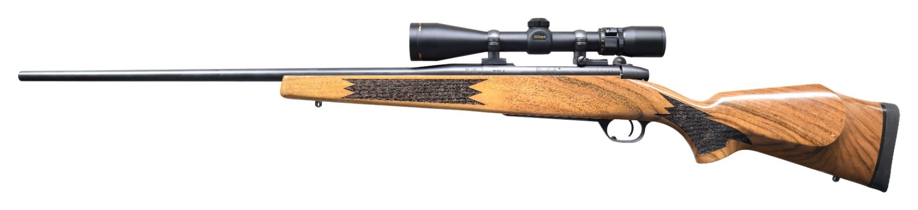 Cal. 30-06. S# WB016692. Bbl. 24". Rifle is sighted with a Nikon Prostaff 3-9x power scope. Scope has very good optics & duplex crosshair reticle. Atascadero, CA made Weatherby MKV rifle. Matte blue finish. Checkered pistol grip walnut stock with right handed cheekpiece, bottom mounted sling studs & Pachmayr Decelerator recoil pad. LOP: 13 5/8". CONDITION: stock shows retains much varnish with a few scattered handling marks. Metal retains 95% original matte dull blue with a few light scratches & handling marks on the exposed edges. Action functions properly when hand cycled. Bright near excellent bore. (25-1495/MJC). MODERN. $800-1200.