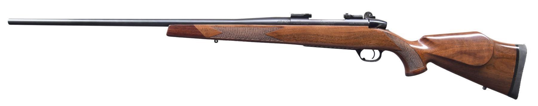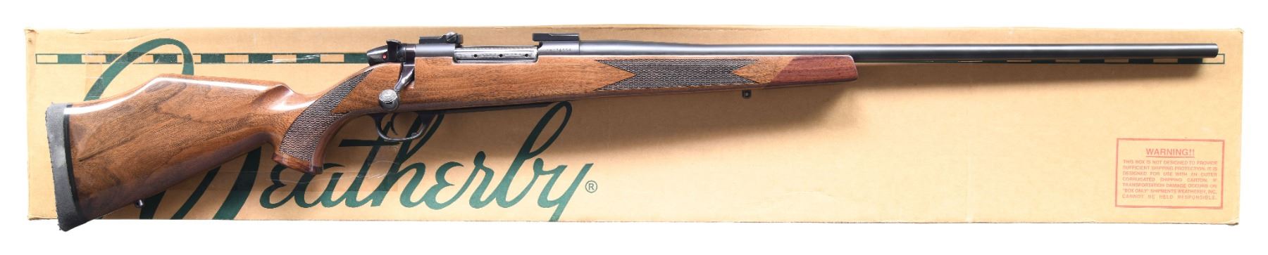 Cal. 300 Wby Mag. S# SB074550. Bbl. 26". Receiver has scope mounts but no optics present. Atascadero, California made Weatherby MKV rifle. Matte blue finish. Checkered pistol grip walnut stock with right handed cheekpiece, bottom mounted sling studs & Pachmayr Decelerator recoil pad. LOP: 13 1/2". UNATTACHED ACCESSORIES: matching numbered factory box. CONDITION: recoil pad shows some light dirt staining & stock shows some minor handling wear. Metal shows a few scattered light handling marks but retains most of its original bluing. Action functions properly when hand cycled. Near excellent bright bore. (25-1496/MJC). MODERN. $800-1200.