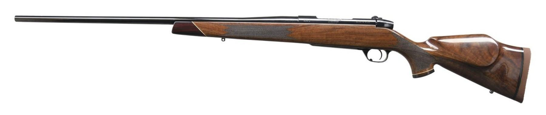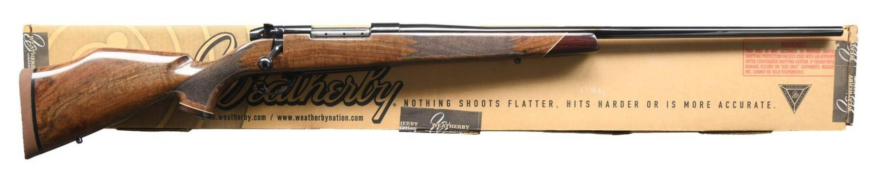MATCHING FACTORY BOX. Cal. 300 Wby Mag. S# PB043400. Bbl. 26". Mark V Deluxe bolt action rifle mfg. by Weatherby. The left side of the bbl. is marked "USE ONLY/ 300 WBY MAG", with "MARK V", followed by the Weatherby trademark logo and "MADE IN U.S.A." marked on the left side of the receiver. Metal components exhibit a lustrous blue finish, with the trigger guard and floorplate exhibiting a high polish black anodized finish. High gloss walnut Monte Carlo pattern buttstock featuring diamond point checkering at the wrist and forearm, as well as a rosewood forend and grip cap. UNATTACHED ACCESSORIES: matching factory box. CONDITION: near new, with metal components retaining virtually all of their original factory finishes overall. Mirror bore, exhibiting well defined rifling throughout. Walnut stock is excellent overall. Box shows some mild exterior wear, but otherwise remains sturdy and serviceable. PROVENANCE: The Collection of Gun Sport Ltd owned by Jon R. Thomas. (23-3818/MLW). MODERN. $800-1,200.