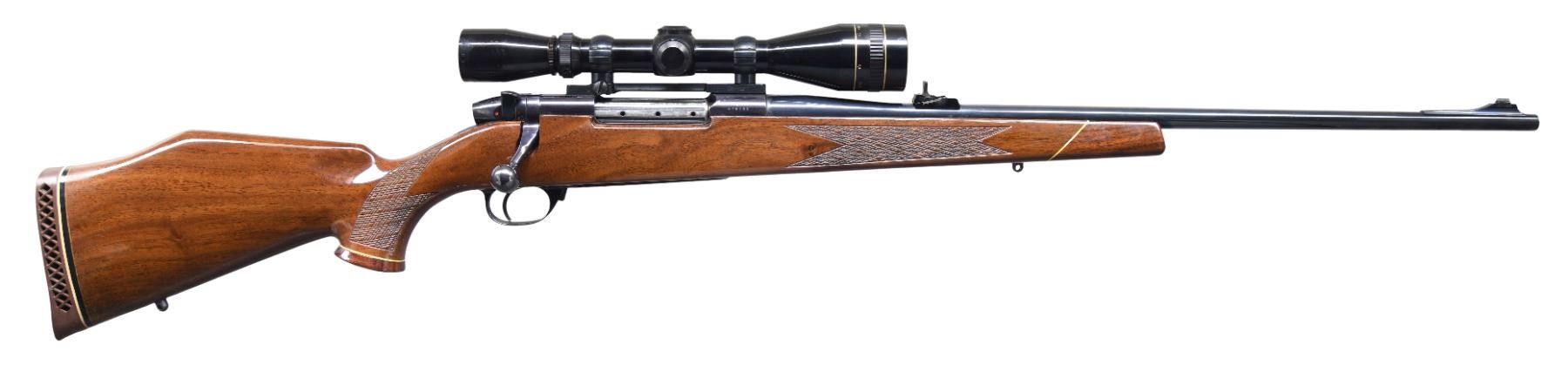 Cal. 300 Wby Mag. S# H79130. Mfg. in Japan by Howa. Barrel 24" w/ ramp blade front sight & Williams rear sight. Leupold 3-9x AO scope (S# F1333352, 1975). with duplex reticle on Redfield rings & base. Monte Carlo walnut stock with skip-line checkering, rosewood forearm tip, rosewood swelled grip cap, sling eyes & Weatherby ventilated pad. CONDITION: very good wood & metal finish showing light handling marks throughout. Very good bore. Scope has very good finish with clear, serviceable optics. (25-984/MD). MODERN. $1,000-1,500.