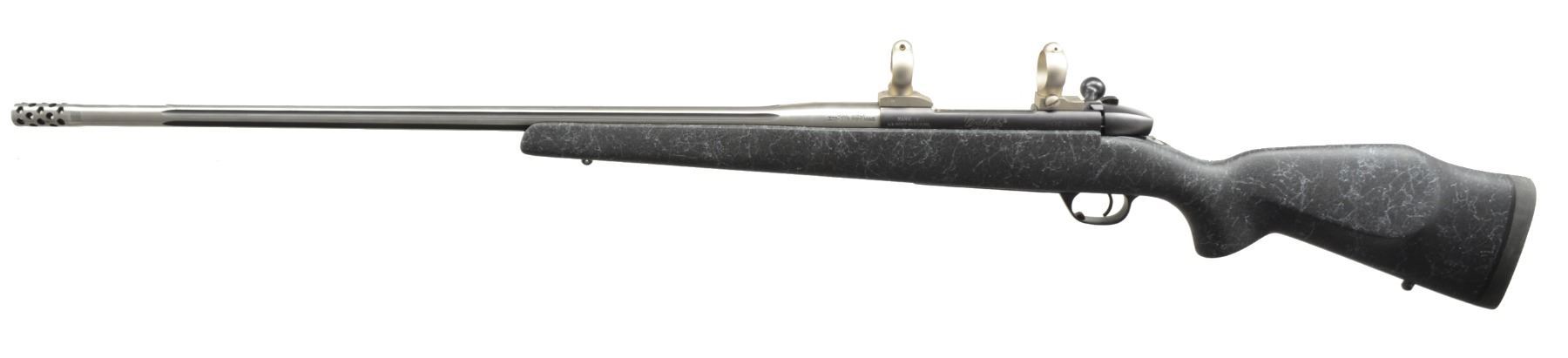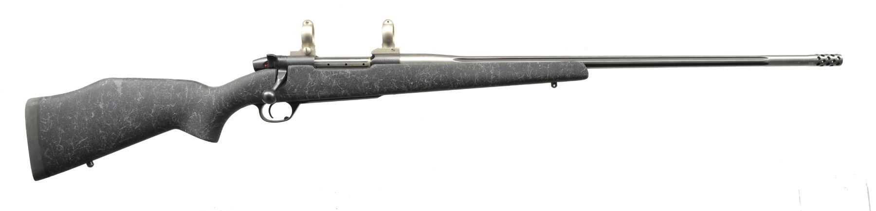 Cal. 338/378 Weatherby Mag. S# SB051779. Bbl. 28" fluted stainless steel w/ muzzle brake, w/ caliber marking at left rear. Black coated Weatherby Mark V action, has alloy bottom metal. Composition stock w/ free floating bbl. has Monte Carlo comb, measures 14 3/4" over black Decelerator pad. Action fitted w/ nickel plated Buehler scope bases & rings. WEIGHT: 8 lbs. 15 oz. CONDITION: very close to "as new" w/ some operational marks on bolt. (20-595/MGM136). MODERN. $1,000-1,500.