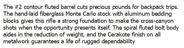 Weighing a mere 5.9 pounds (6-lug Action) SUB-MOA accuracy and durable performance finish this rifle is home in any backcountry situation. The #2 contour fluted barrel cuts precious pounds for backpack trips. The hand-laid fiberglass Monte Carlo stock with aluminum bedding blocks gives this rifle a strong foundation to make the cross-canyon shots when the opportunity presents itself. The spiral fluted bolt body aides in the reduction of weight and the Cerakote® finish on all metalwork guarantees a life of rugged dependability