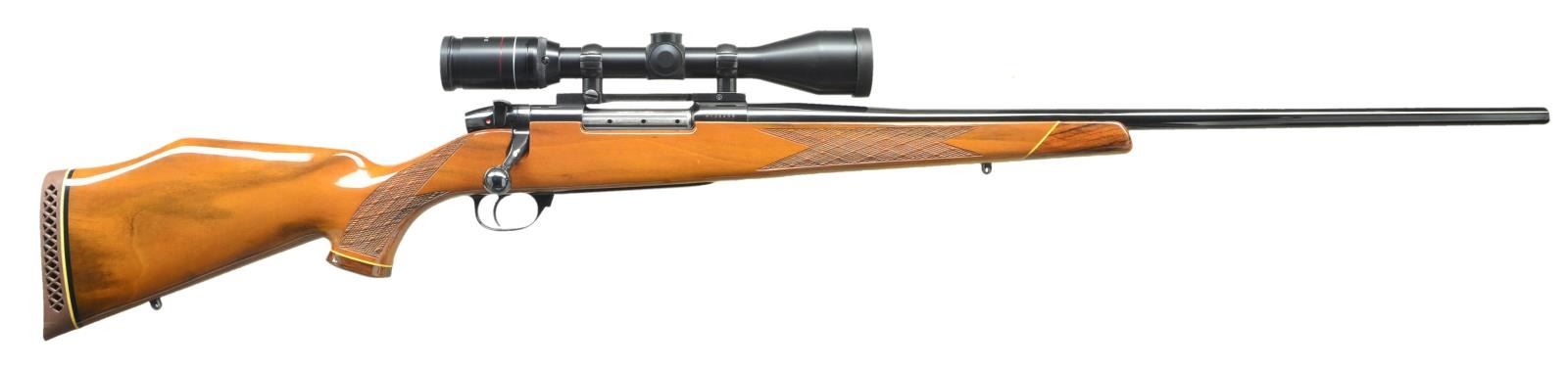 Cal. 300 Weatherby Magnum. S# H138489. Bbl. 26". Japanese mfg. rifle with blued metal and rosewood tipped and pistol grip capped Monte Carlo stock featuring checkered forend and grip inlayed with a white diamond along with sling swivel studs. Barrel has no provisions for sights but a Weatherby Supreme 3-9x44 scope with duplex reticle is mounted on a Redfield one piece base. LOP: 13 3/8” to the factory recoil pad. CONDITION: metal retains about 98% original finish on the barrel and receiver with the floorplate around 90% with freckling throughout. Stock retains much of its original glossy finish and sharp checkering. Bore is good/good plus with strong rifling and some stubborn fouling. (22-3742/CW). MODERN. $1,200-1,600.