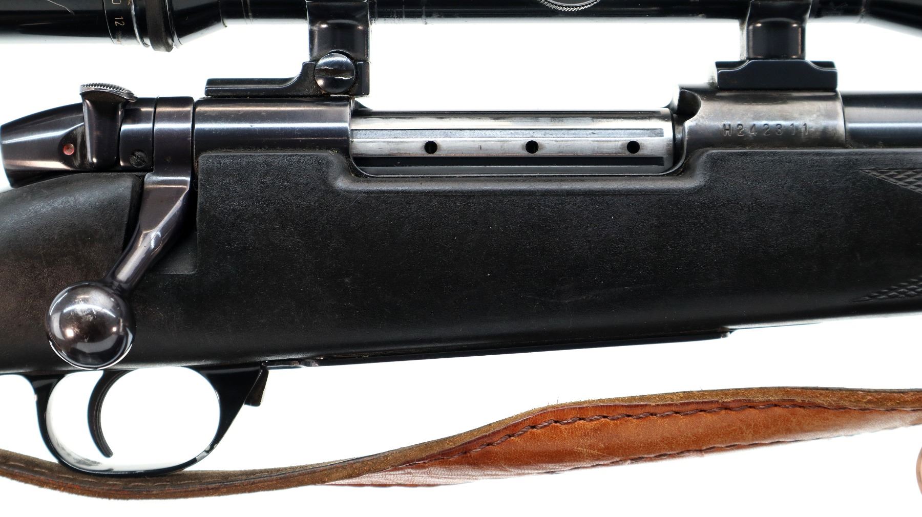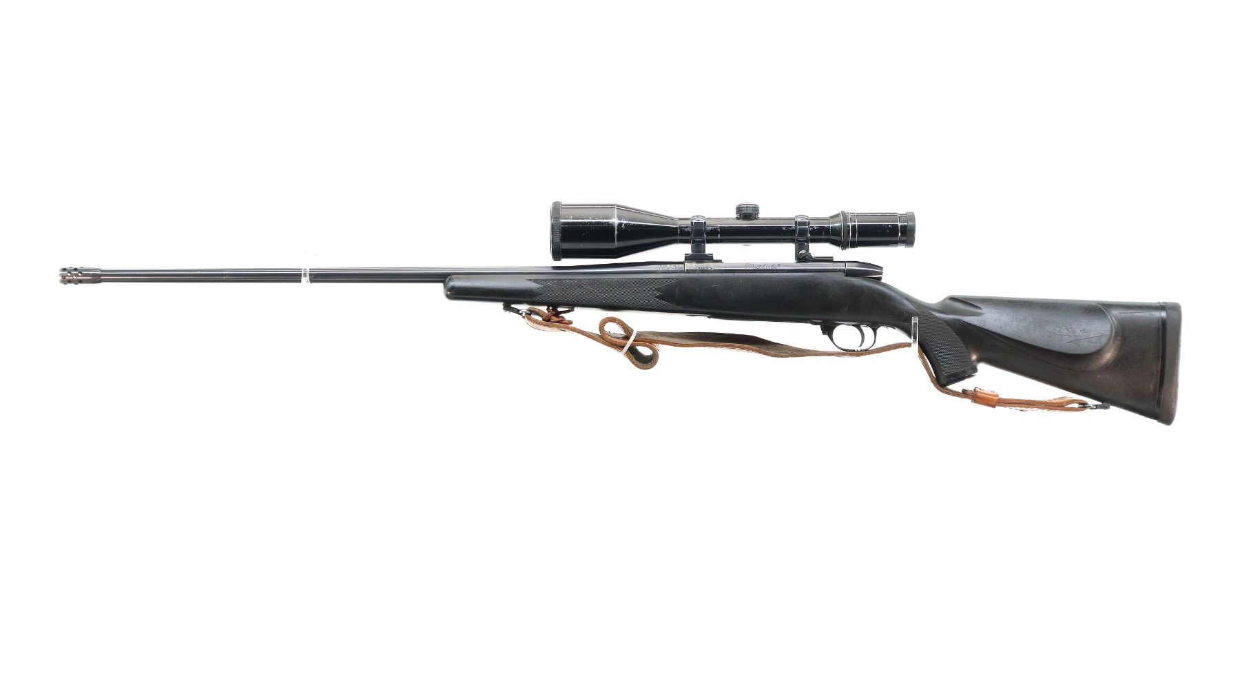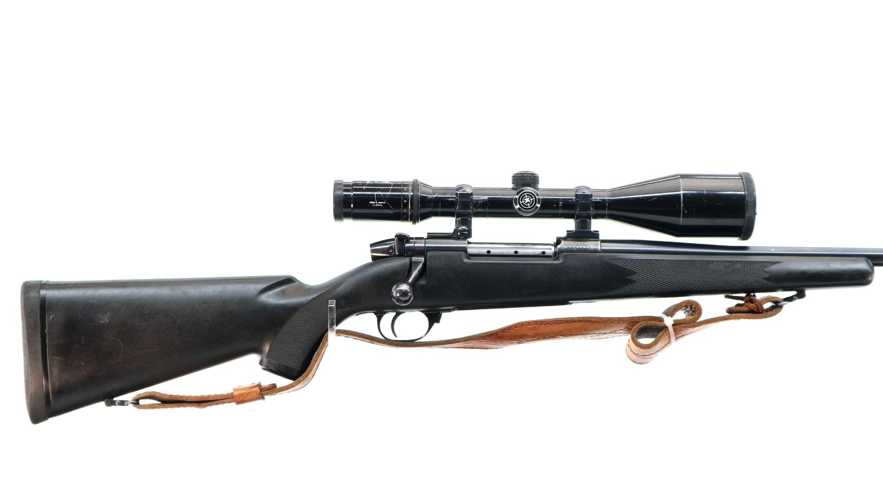 Main Description: No sights, polish blued finish, barrel threaded at muzzle with ported brake installed, receiver drilled and tapped with Kahles Helia L 3-12x50 scope installed, clear optics with duplex crosshair. Fluted bolt with smooth knob. One piece black synthetic stock, checkered forearm and pistol grip, black rubber recoil pad, grip cap, hinged floor plate, sling swivels with brown leather sling.