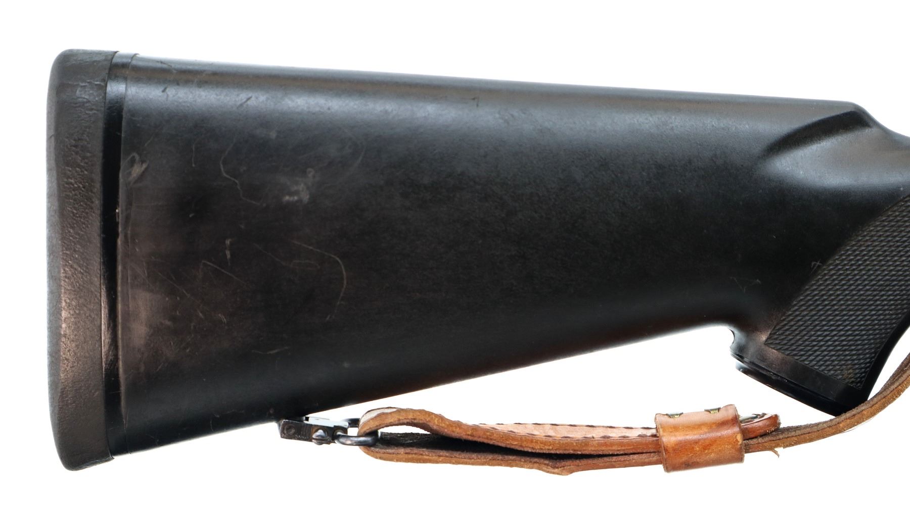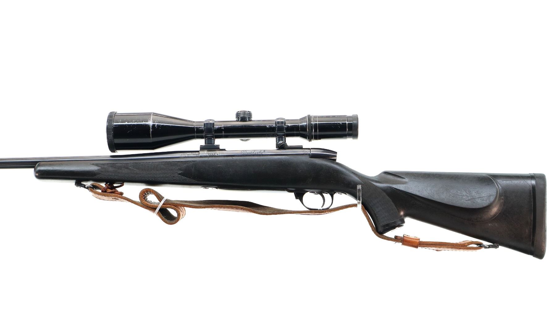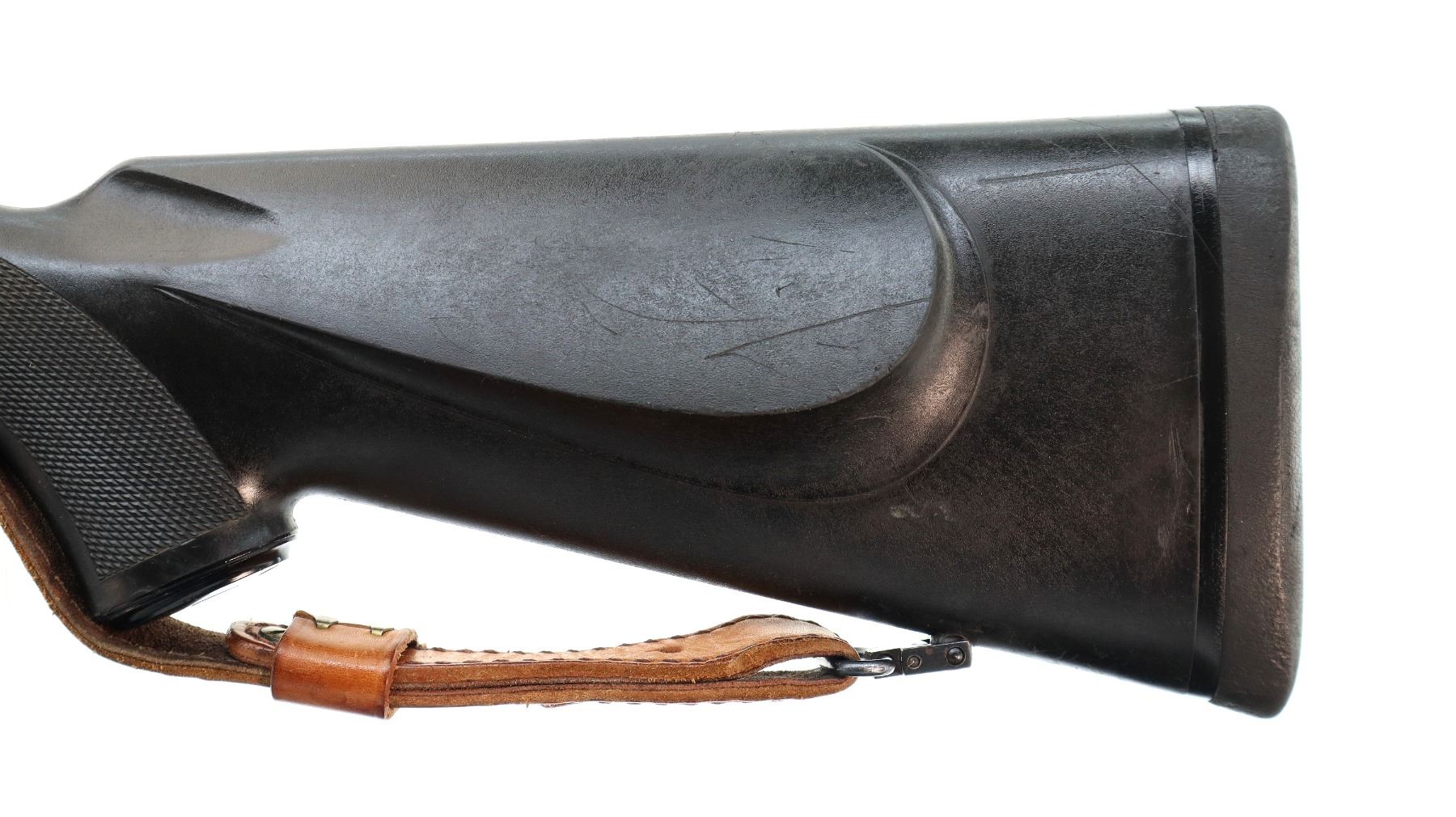 Main Description: No sights, polish blued finish, barrel threaded at muzzle with ported brake installed, receiver drilled and tapped with Kahles Helia L 3-12x50 scope installed, clear optics with duplex crosshair. Fluted bolt with smooth knob. One piece black synthetic stock, checkered forearm and pistol grip, black rubber recoil pad, grip cap, hinged floor plate, sling swivels with brown leather sling.