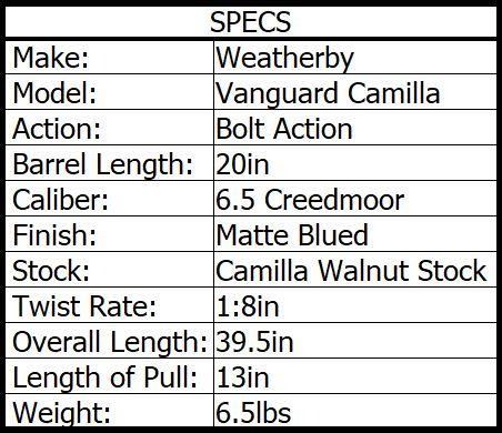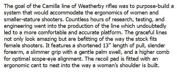 The Vanguard Camilla Rifle designed by women, built by Weatherby, incorporates a high comb, along with a number of other features that make this rifle superbly comfortable to shoot. The buttstock is angled away from the body, which is a better fit for the female anatomy and nestles easily into the shoulder. The slim pistol grip has a shorter grip-to-trigger reach, ideal for slightly smaller hands, and the 13-inch length of pull (LOP) and slender fore-end reduce overall weight and length without compromising feel and balance. A combination that makes this a super-fast-handling rifle that is also easy to carry.