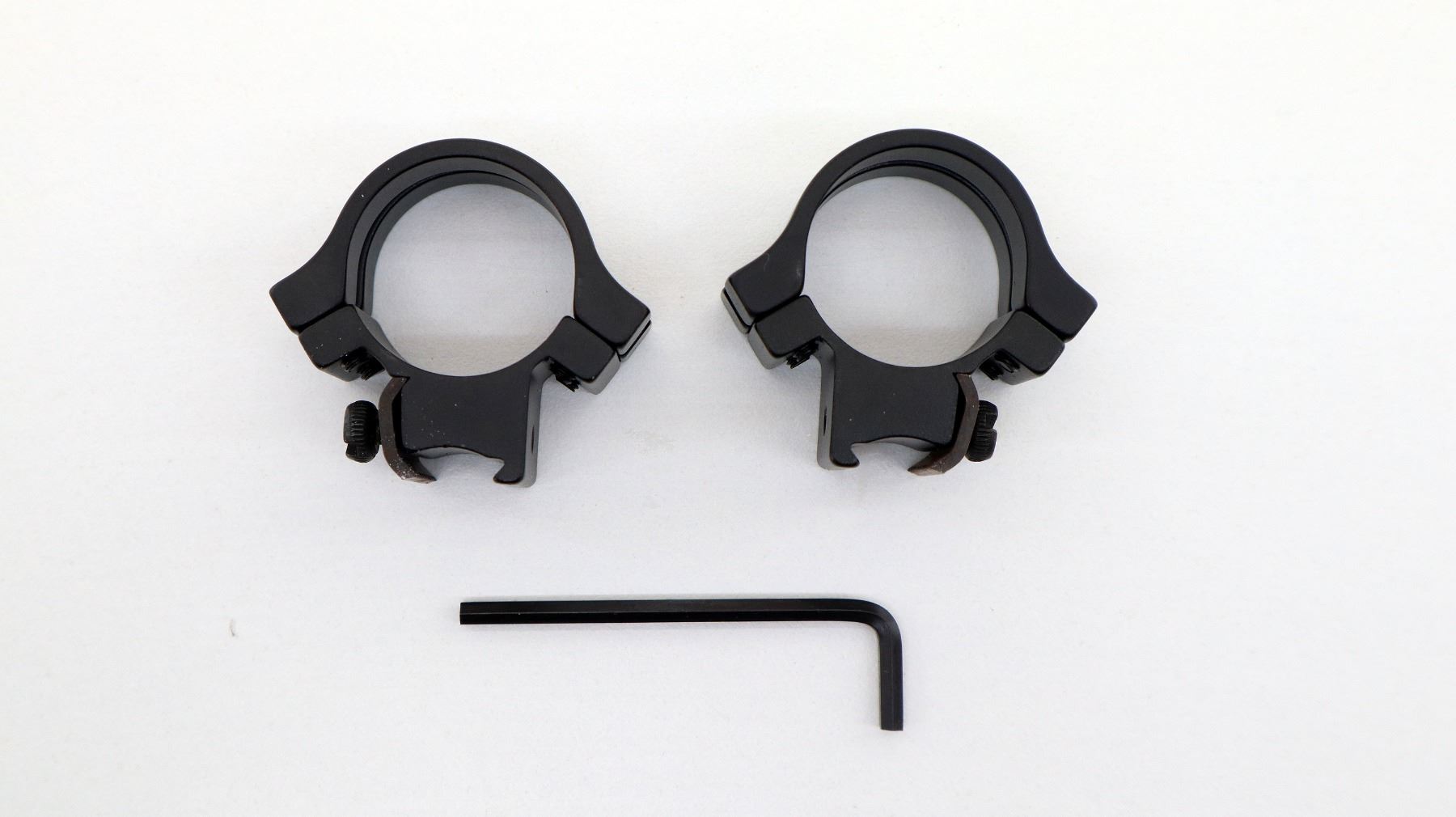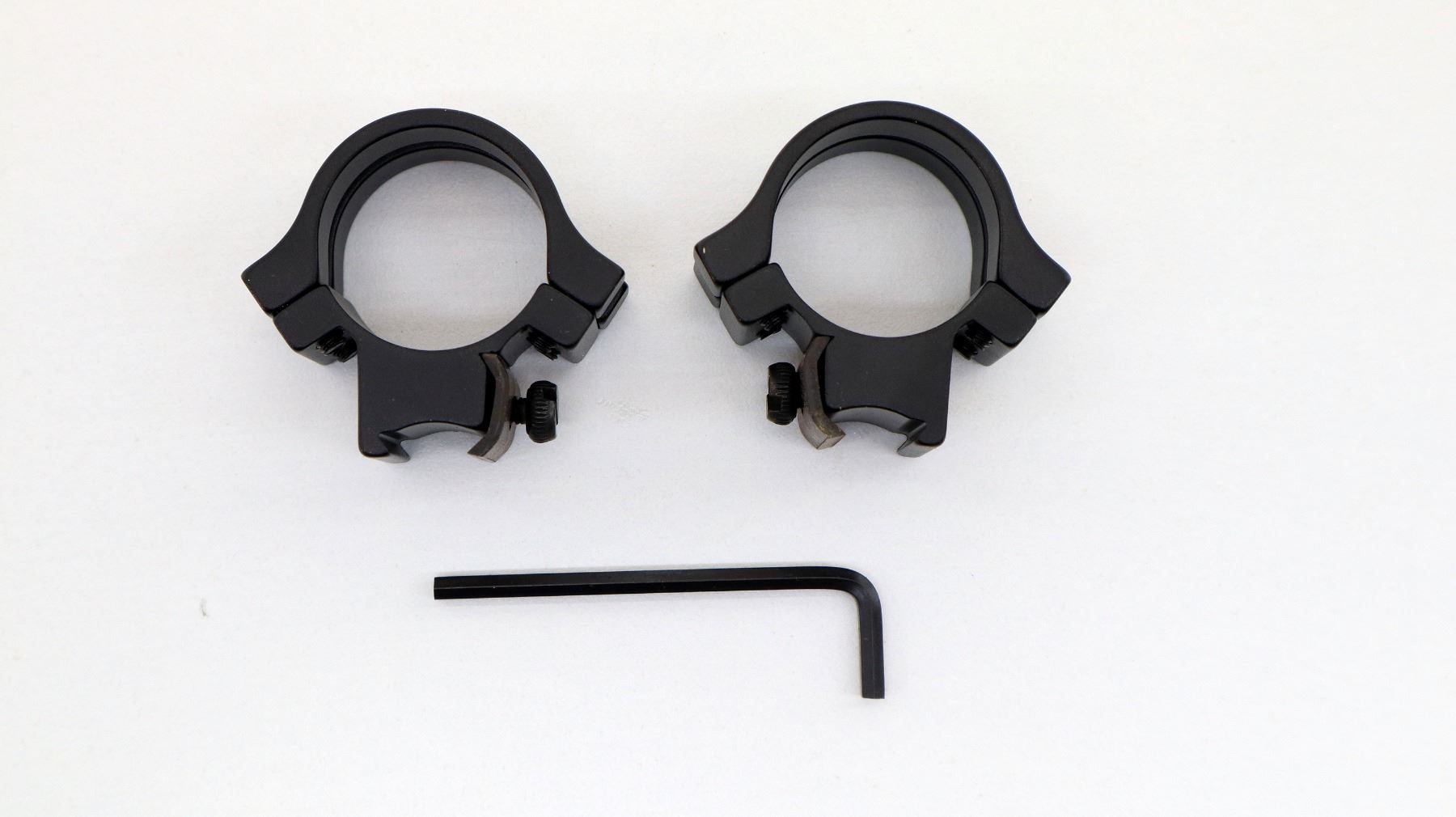(1) 1" RINGS, .22 TIP OFF, 4 ALUMINUM STRAPS, FITS UP TO 36MM OBJ LENS, FOR FIREARMS WITH 3/8" GROOVED RECEIVERS, MATTE BLACK, PART NO. 49053, NEW OLD STOCK, IN ORIGINAL PACKAGING. MAY REQUIRE FITTING. SEE PHOTOS.