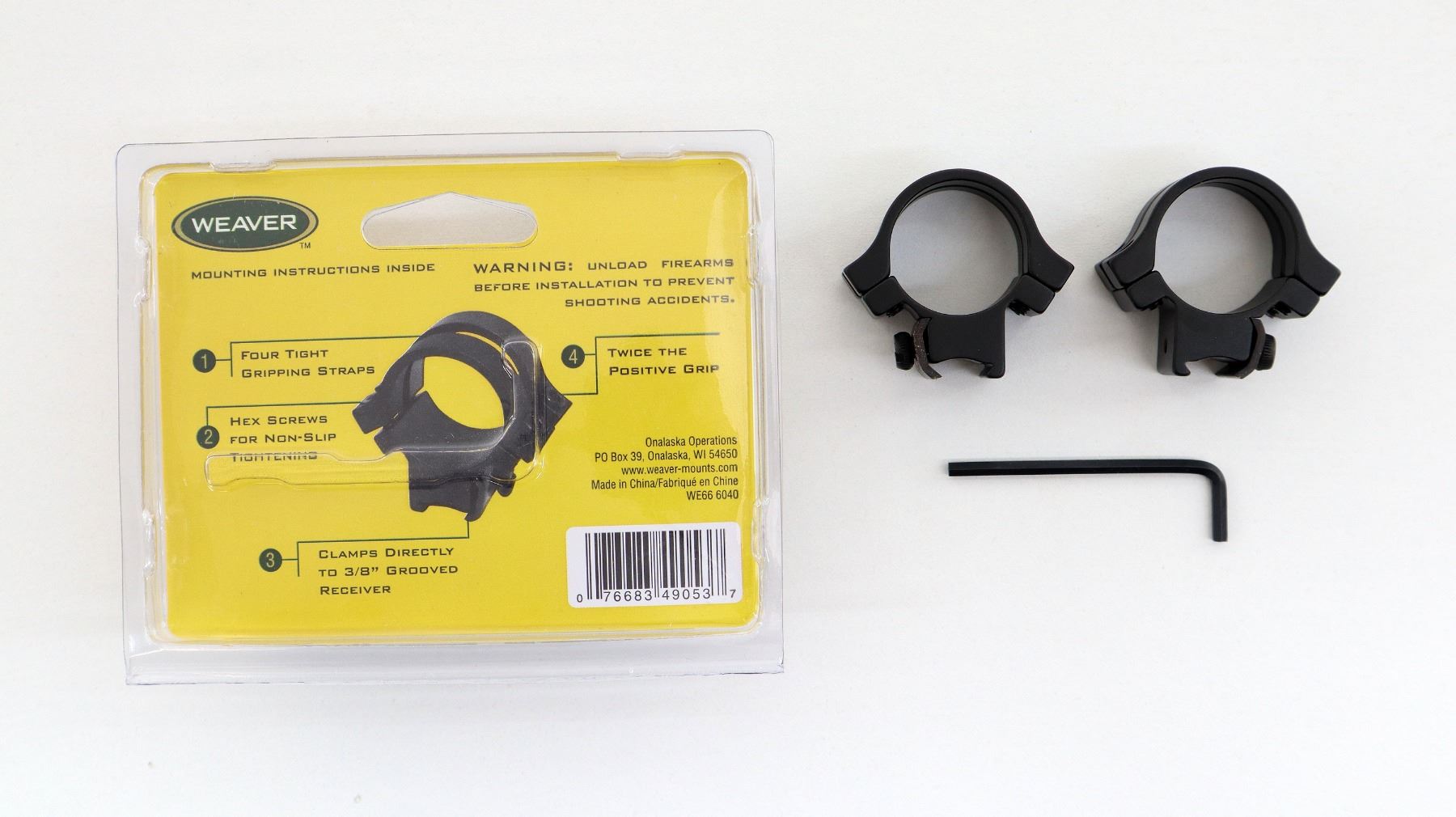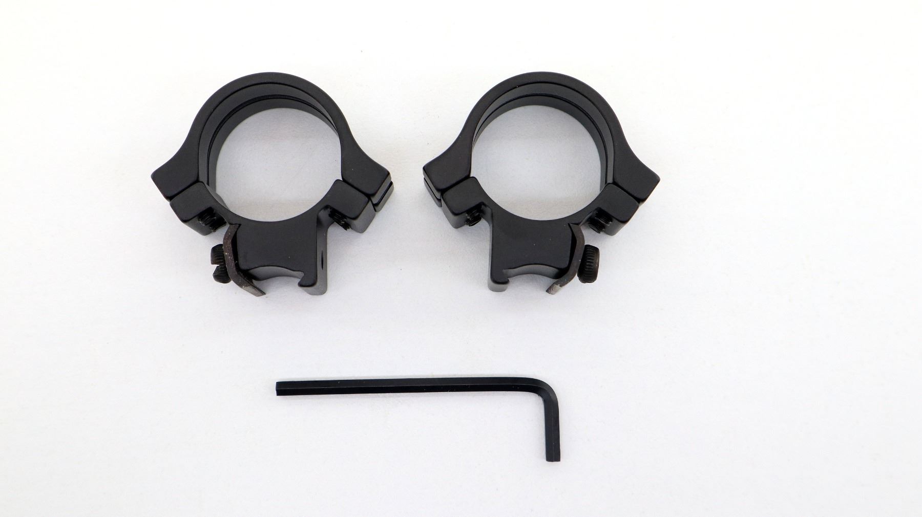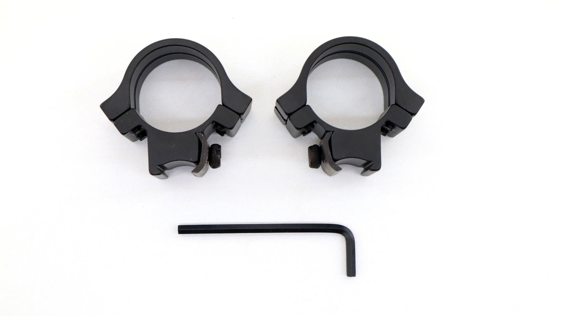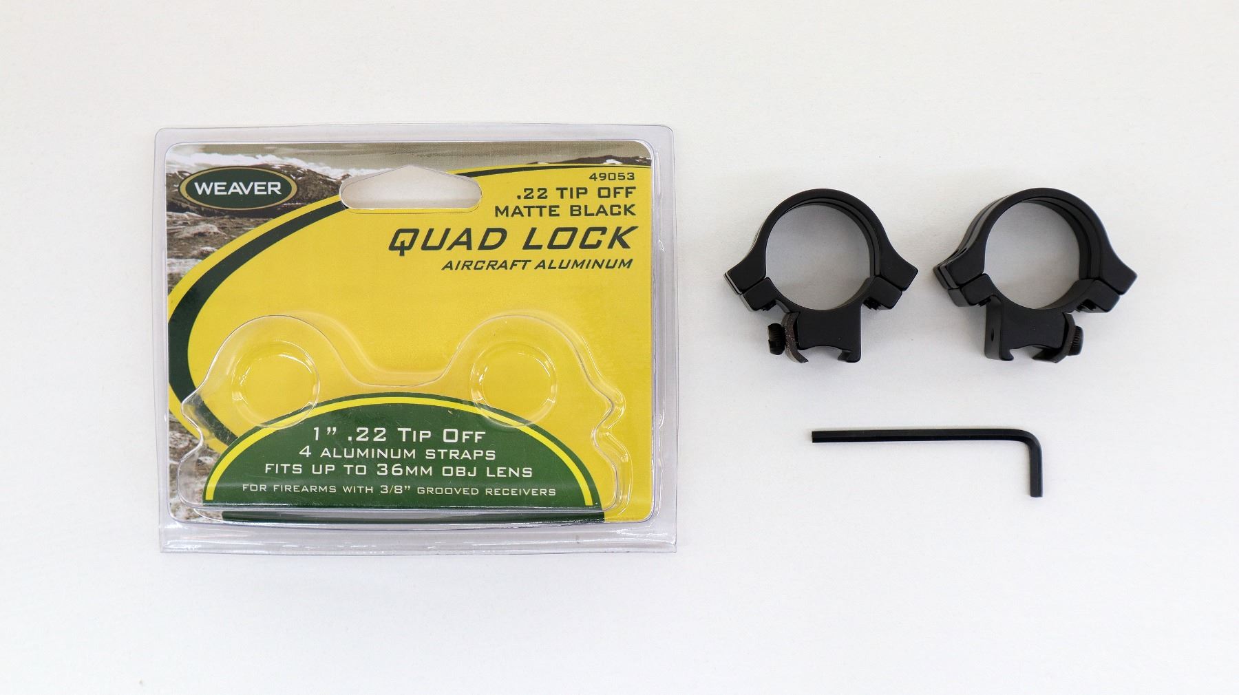 (1) 1" RINGS, .22 TIP OFF, 4 ALUMINUM STRAPS, FITS UP TO 36MM OBJ LENS, FOR FIREARMS WITH 3/8" GROOVED RECEIVERS, MATTE BLACK, PART NO. 49053, NEW OLD STOCK, IN ORIGINAL PACKAGING. MAY REQUIRE FITTING. SEE PHOTOS.