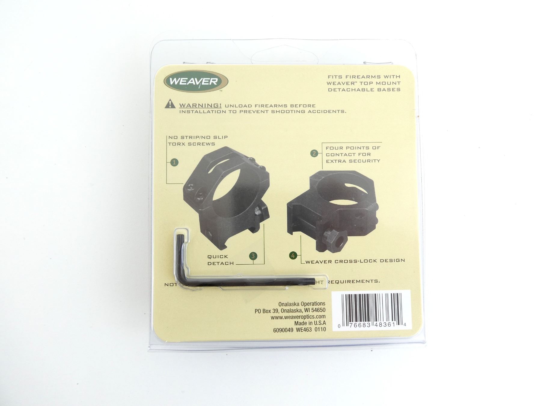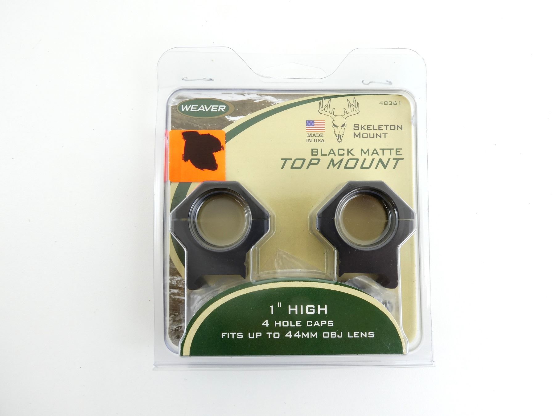 (1) SET OF WEAVER SCOPE RINGS, PACKAGE MARKED: "BLACK MATTE, TOP MOUNT, 1" HIGH, 4 HOLE CAPS, FITS UP TO 44MM OBJ LENS, FITS FIREARMS WITH WEAVER TOP MOUNT DETACHABLE BASES", APPEARS NOS, IN ORIGINAL PACKAGING. SEE PHOTOS.