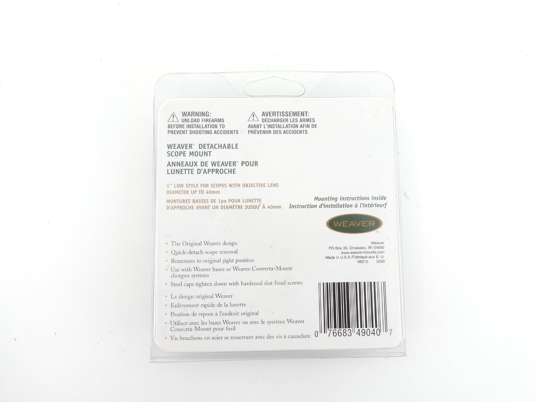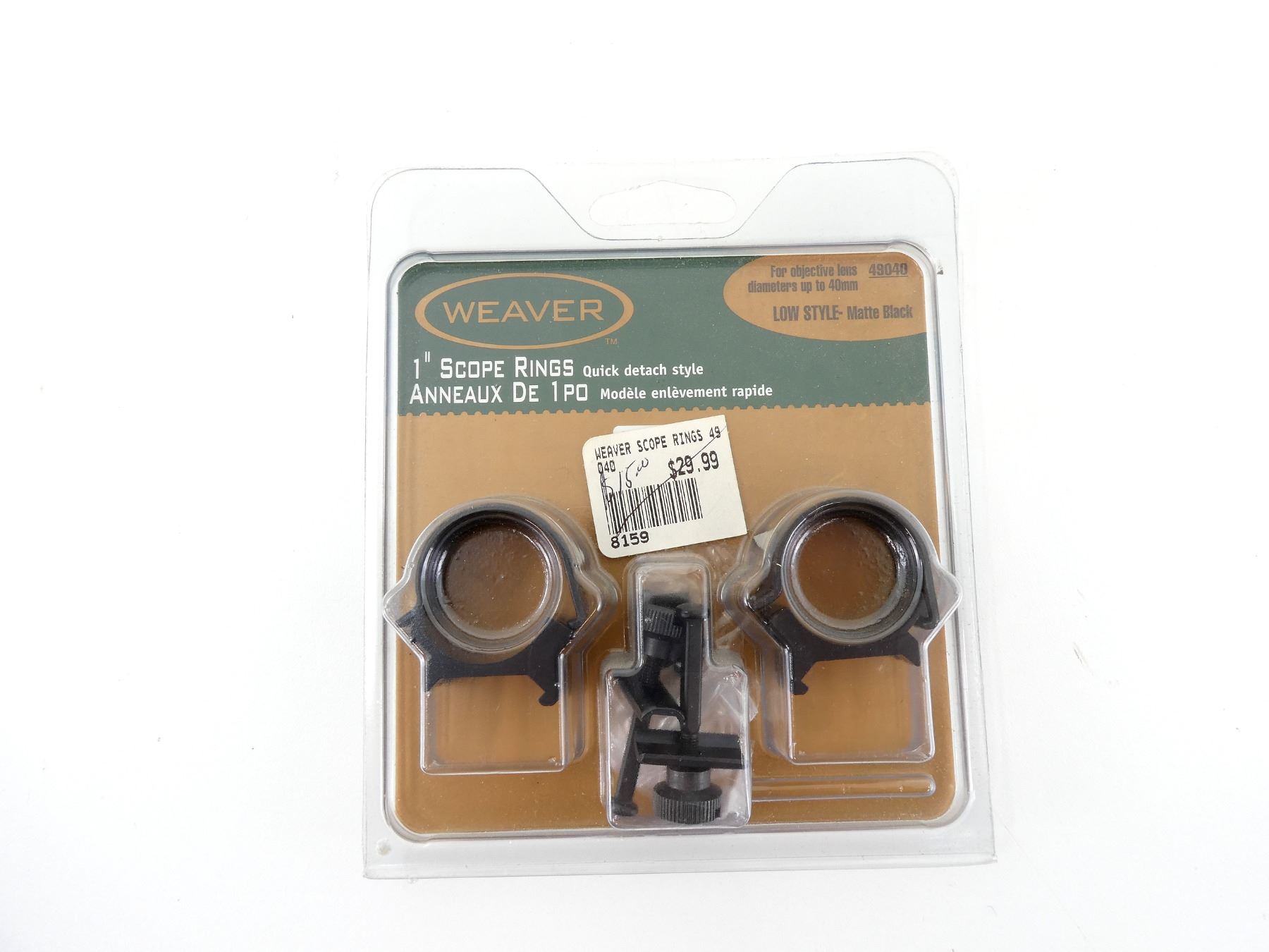 (1) PAIR OF SCOPE RINGS, 1" DIAMETER, MATTE BLACK, LOW / QUICK DETACH STYLE, FOR OBJECTIVE LENS DIAMETERS UP TO 40MM, 49040, NOS, UN-OPENED PACKAGING. SEE PHOTOS.