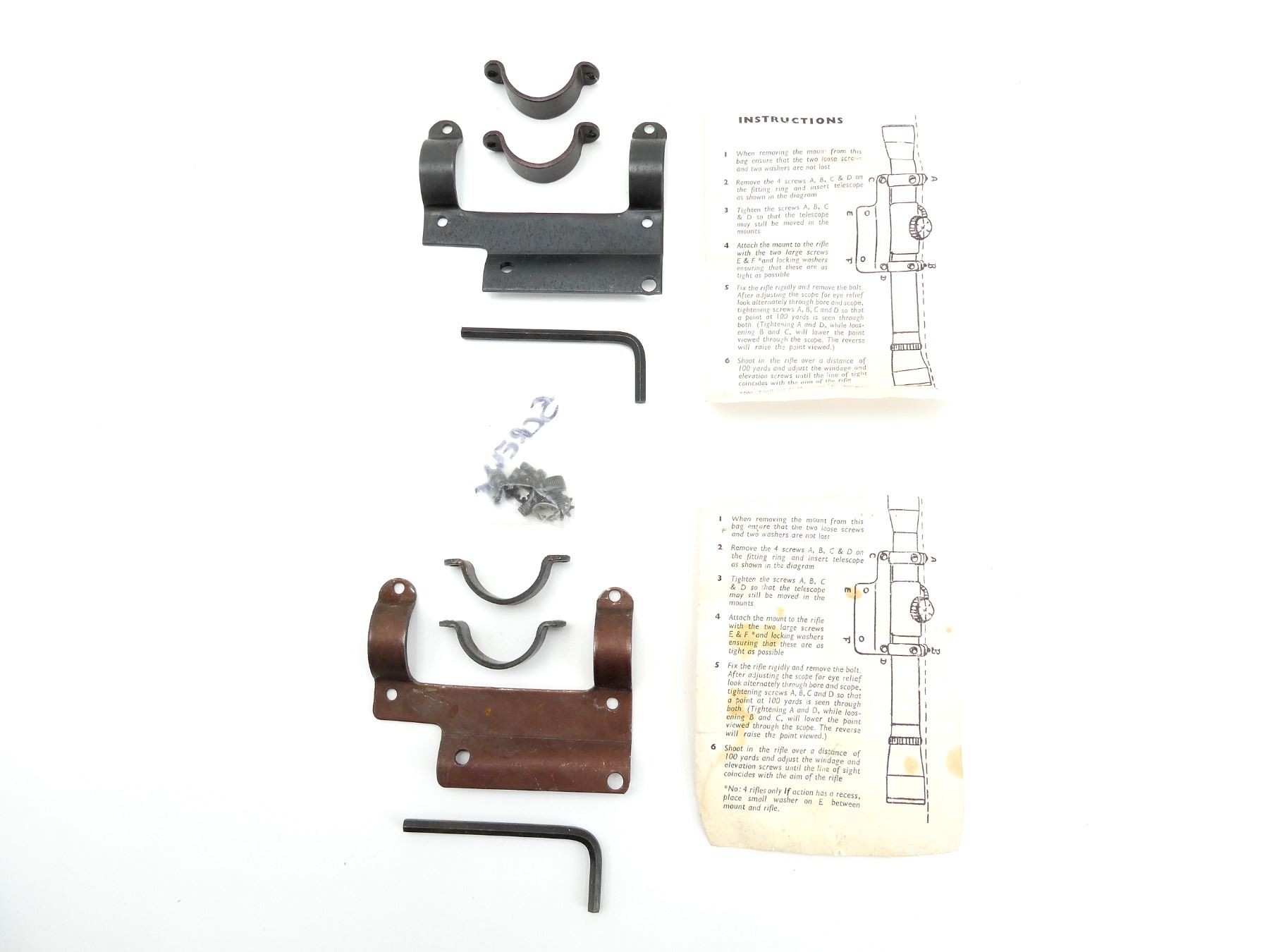 LOT INCLUDES; (2) UNKNOWN .22 SCOPE SIDE MOUNTS, 1" RING DIAMETER, ONE WITH SCREWS, ONE WITHOUT, WITH INSTRUCTIONS, METAL CONSTRUCTION, NO VISIBLE MARKINGS. SEE PHOTOS.