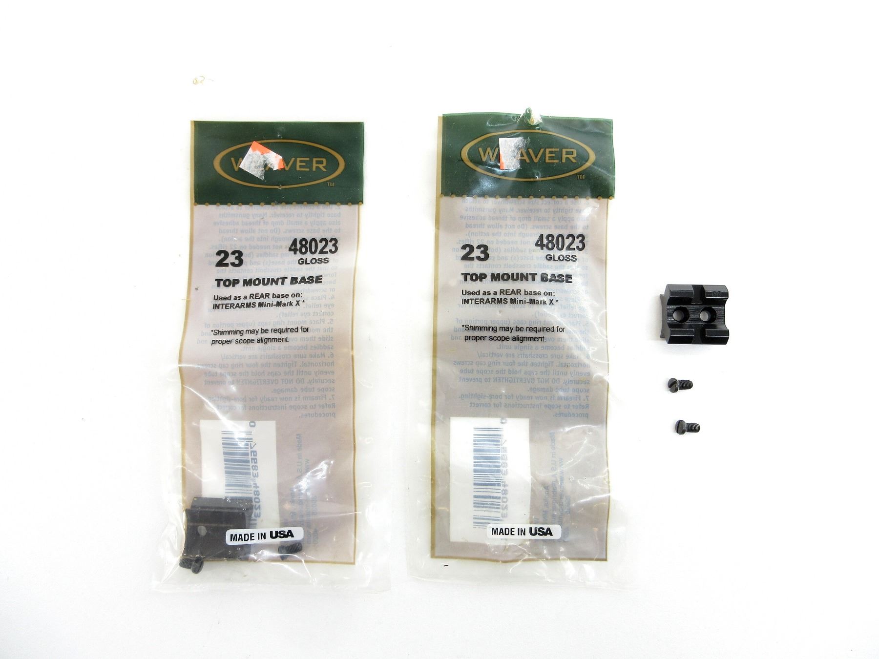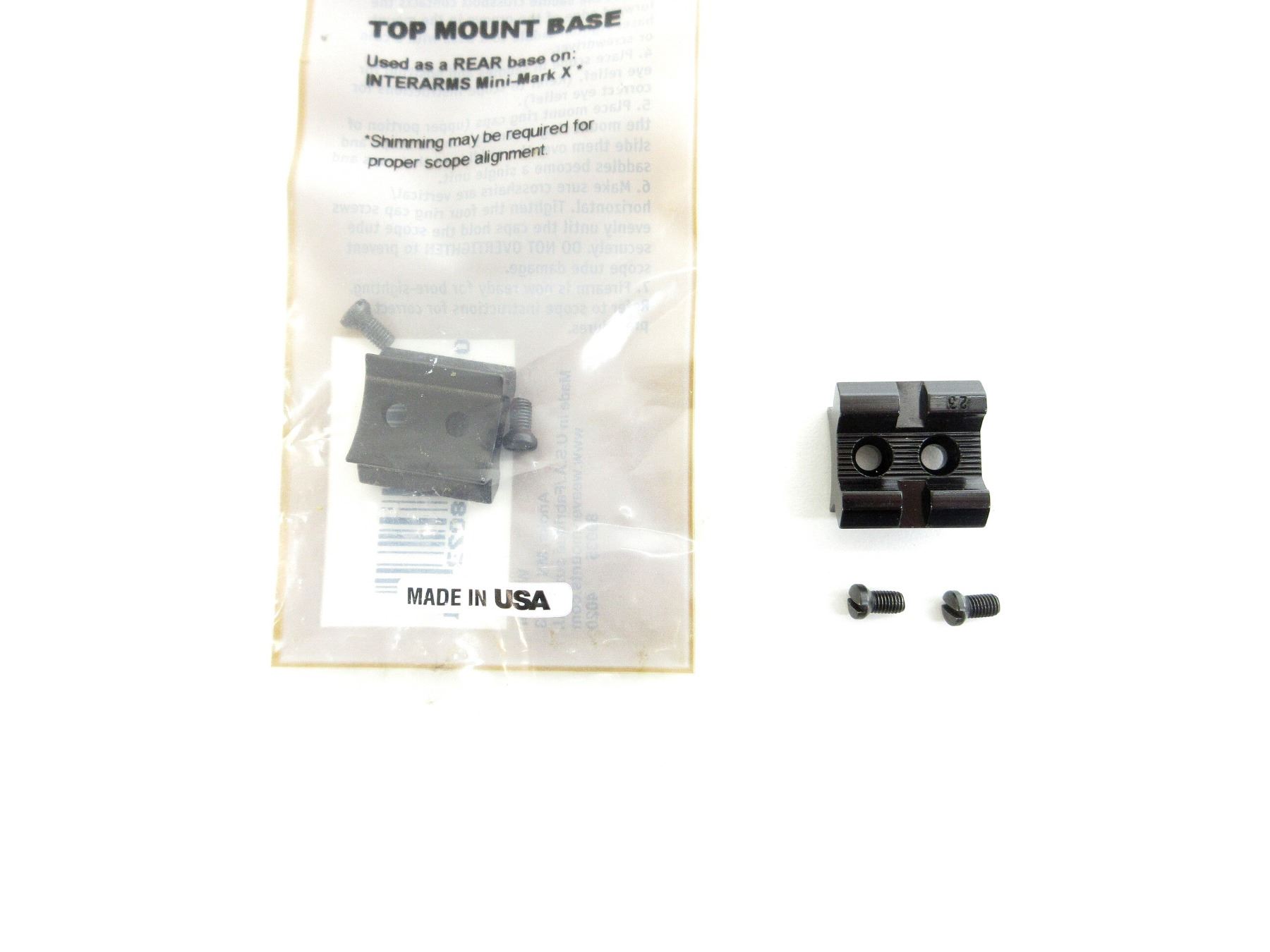 LOT INCLUDES; (2) SCOPE RING BASES, GLOSS BLACK ALLOY CONSTRUCTION, FITS INTERARMS MINI-MARK X, PART #: 48023, APPEARS NEW OLD STOCK IN ORIGINAL PACKAGING, MAY NOT BE COMPLETE. MAY REQUIRE FITTING. SEE PHOTOS.