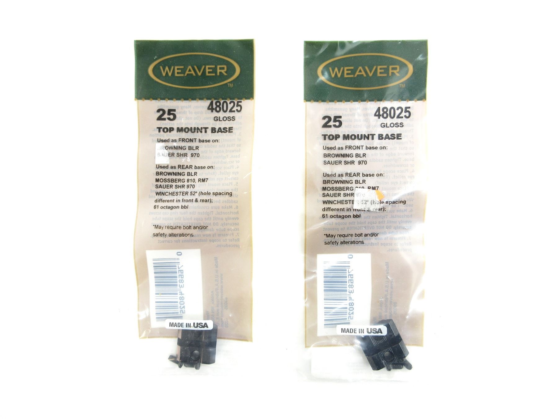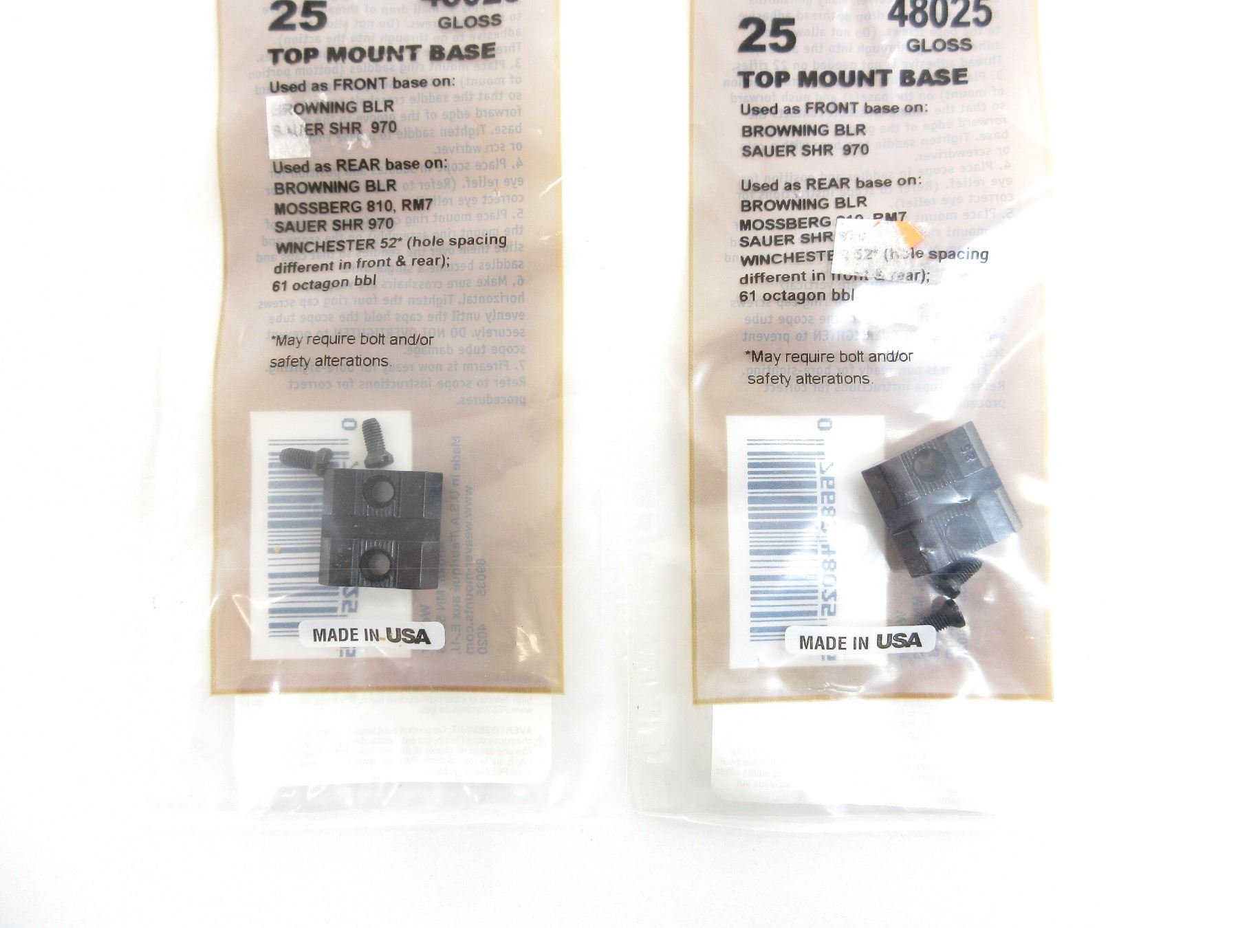 LOT INCLUDES; (2) SCOPE RING BASES, GLOSS BLACK ALLOY CONSTRUCTION, FITS BROWNING BLR / MOSSBERG 810 / WINCHESTER 52" / ETC., PART #: 48025, APPEARS NEW OLD STOCK IN ORIGINAL PACKAGING, MAY NOT BE COMPLETE. MAY REQUIRE FITTING. SEE PHOTOS.