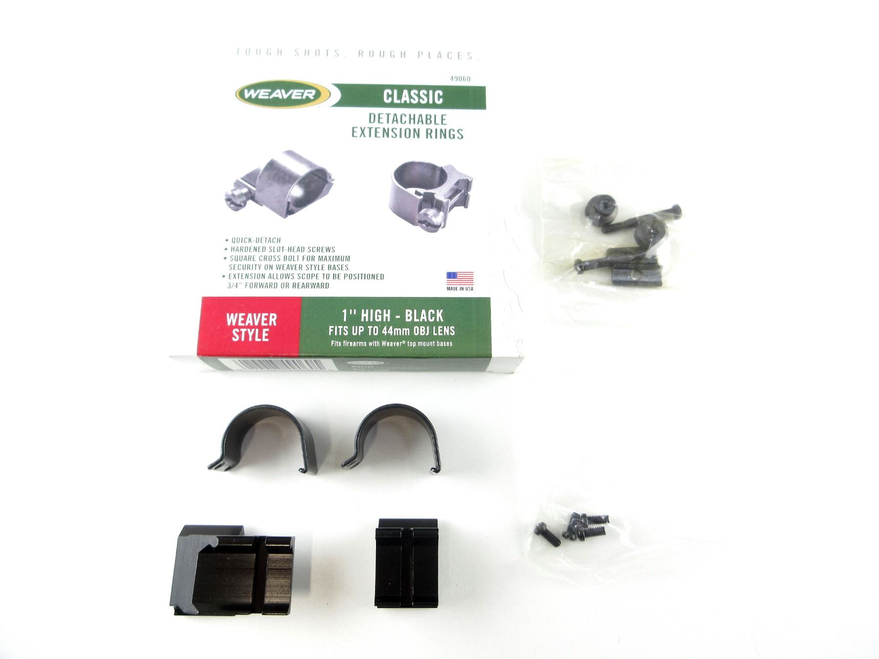 (1) SET OF 1" EXTENSION SCOPE RINGS, FITS UP TO 44MM OBJ LENS, BLACK, HIGH, PART #: 49060, APPEARS NEW OLD STOCK IN ORIGINAL PACKAGING. MAY REQUIRE FITTING. SEE PHOTOS.