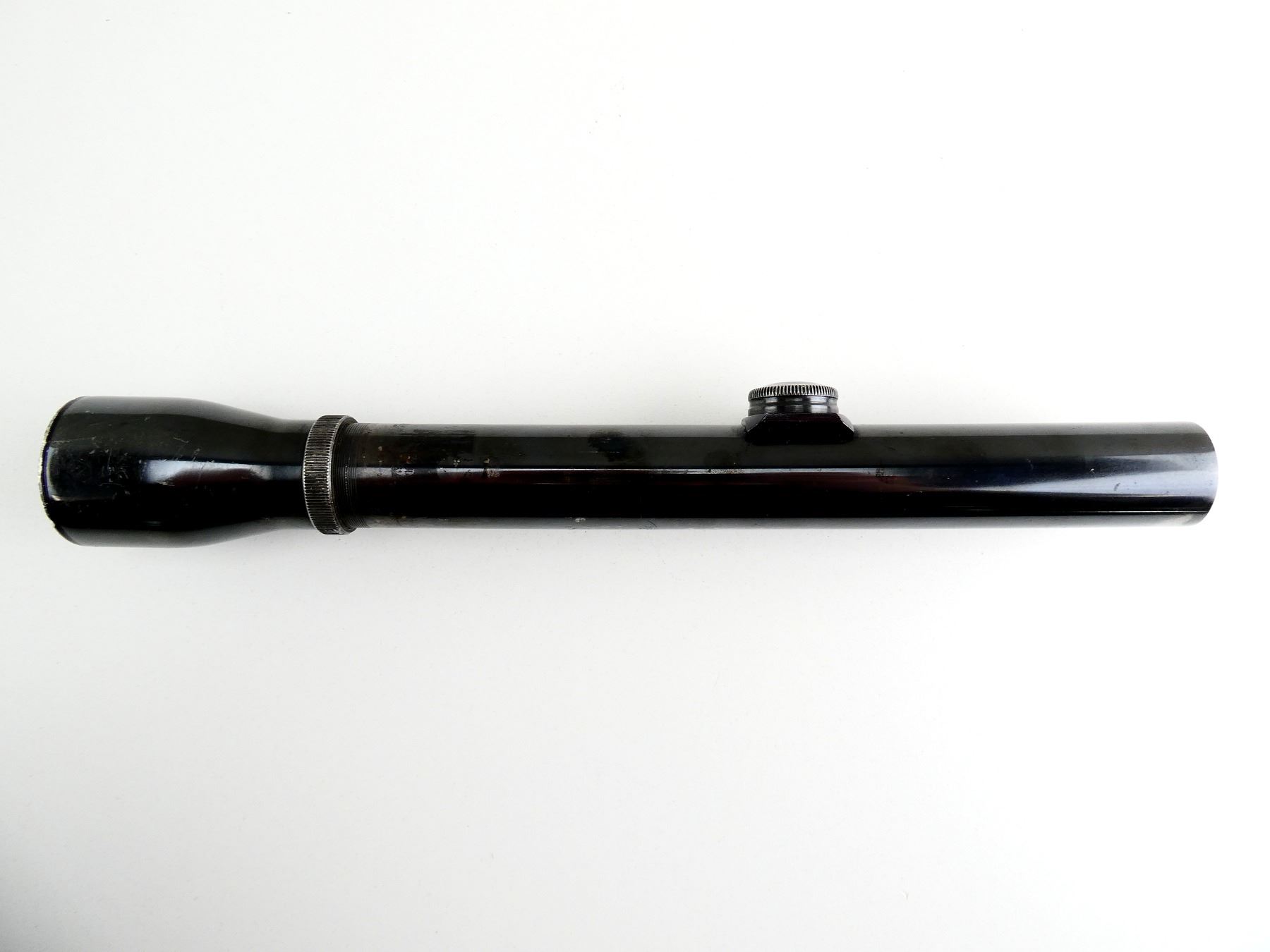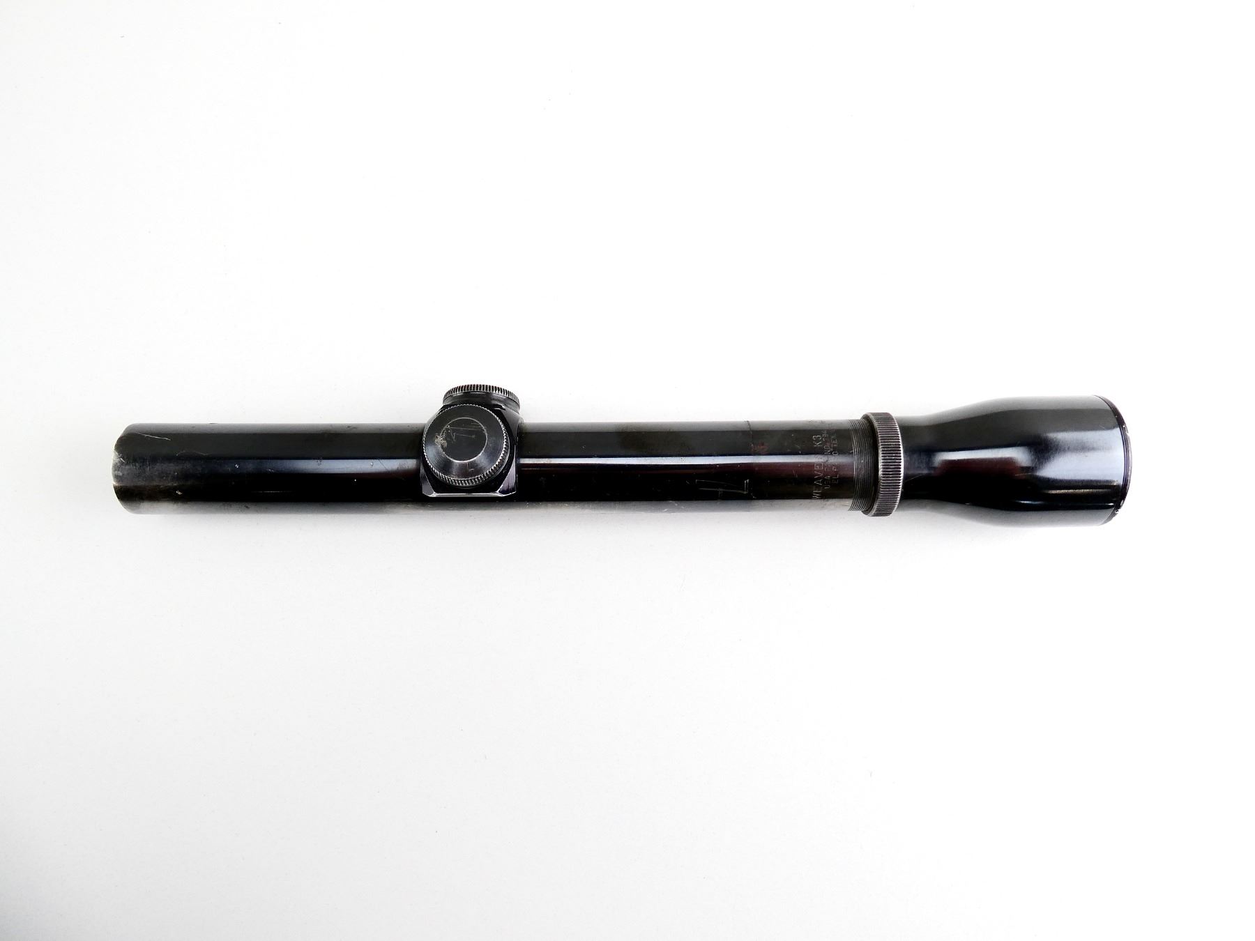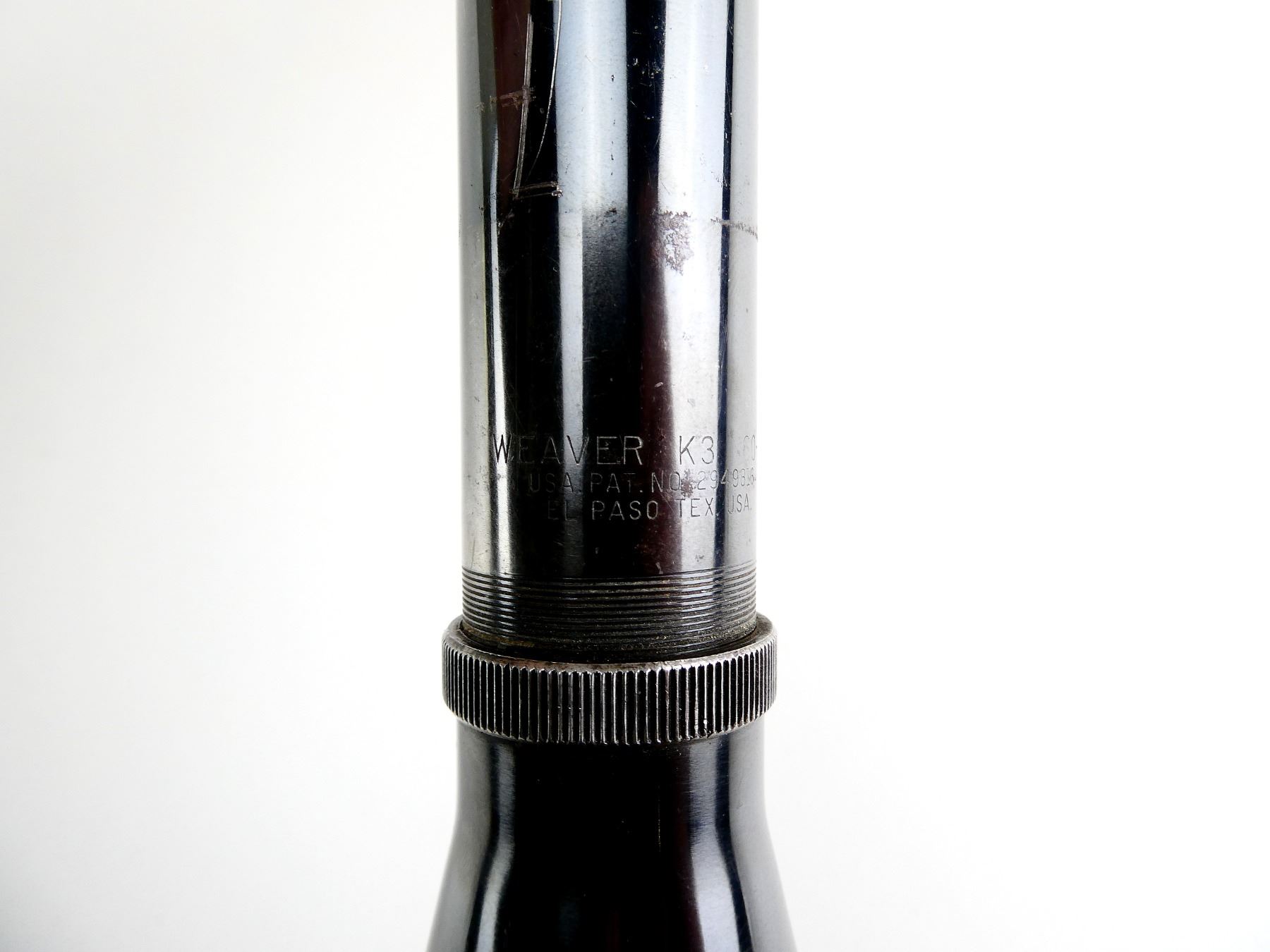 (1) CLEAR OPTICS, SINGLE POST RETICLE WITH FINE LINE, 1" TUBE DIAMETER, WORKING MAGNIFICATION RING, WINDAGE & ELEVATION KNOBS TURN, MARKED: "WEAVER K3 0B, PATENT NO. 2949816", ETC., SHOWS WEAR & TEAR / USE MARKS. SEE PHOTOS.