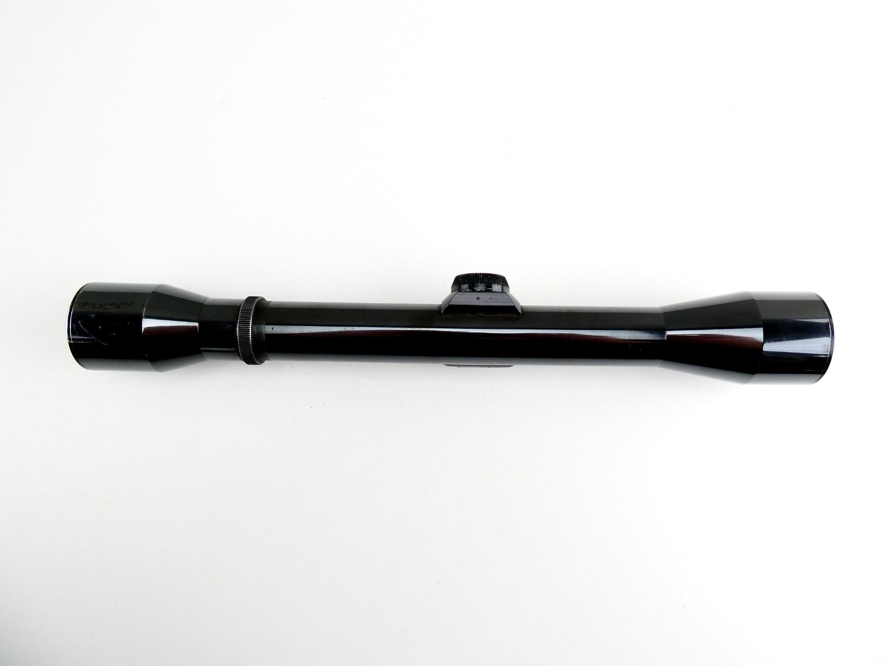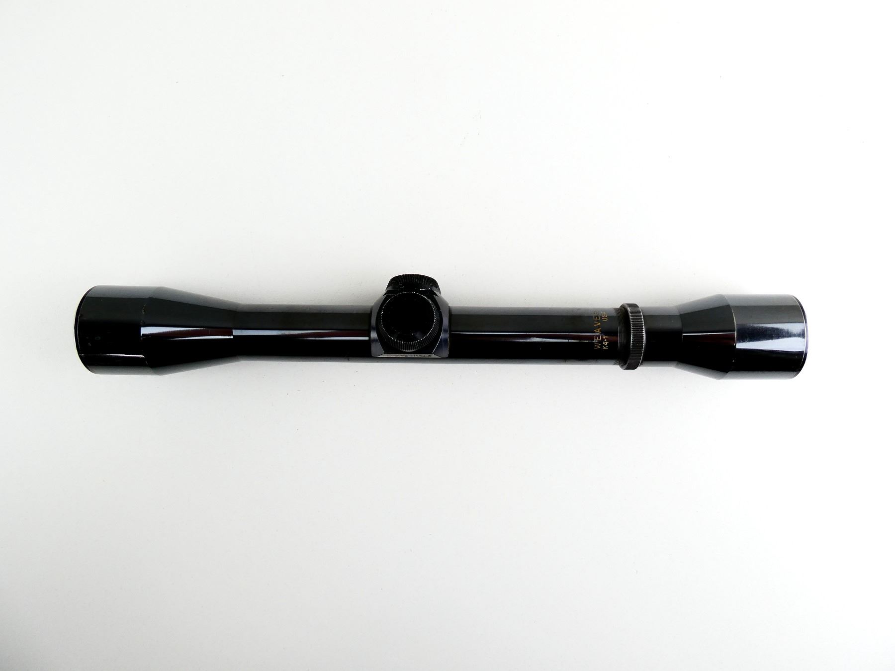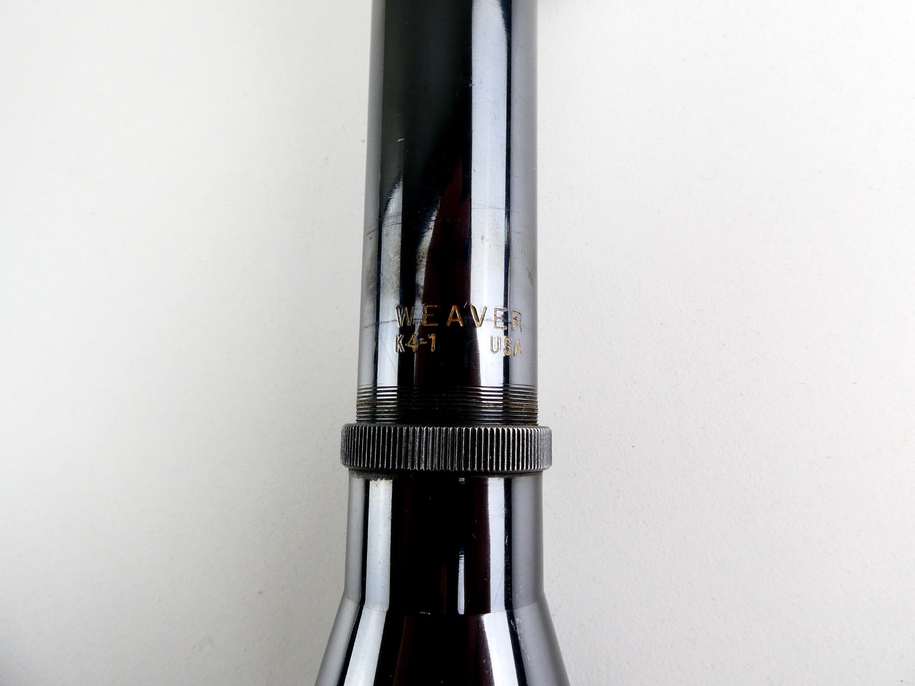(1) CLEAR OPTICS, DUPLEX CROSSHAIR RETICLE, 1" TUBE DIAMETER, WORKING MAGNIFICATION RING, WINDAGE & ELEVATION KNOBS TURN, MARKED: "WEAVER K4-1X MICRO-TRAC", ETC., SHOWS WEAR & TEAR / USE MARKS. SEE PHOTOS.