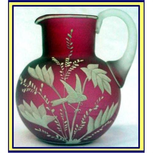 Beautiful old pitcher in rich wine red / deep pink with white overlay in the Webb cameo glass style. Possibly English. Almost certainly 19th century.<BR>Measures almost 5inches high.<BR>Smokey transparent glass handle. The classic round body with Nouveau influenced bird amongst the foliage and grasses scene in raised white. <BR>Excellent condition - no damage of any sort.
