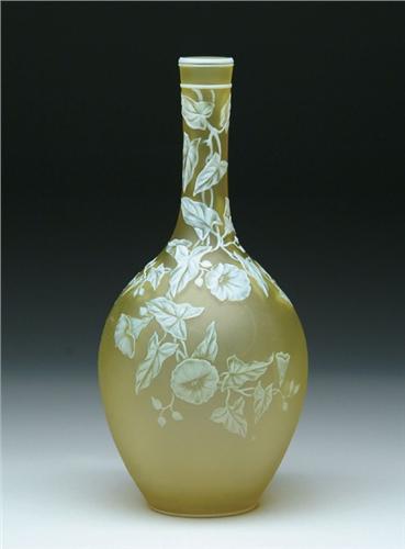 WEBB CAMEO VASE. Beautiful Webb vase has white cameo bellflowers and leaves against a citrine background. Leaves and flowers exhibit wonderful detail. The reverse of vase has a single white cameo butterfly. Signed on the underside "Thomas Webb and Sons Cameo". SIZE: 11 in. t. CONDITION: Very good to excellent. 5-61045